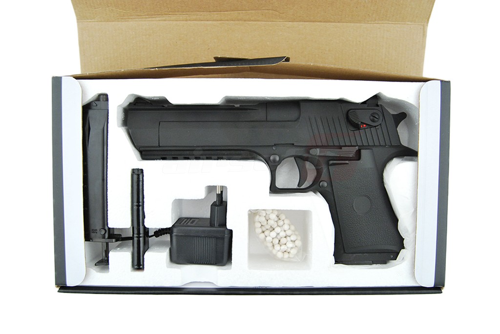 Aceasta replica fabricata de Cyma la prima vedere prezinta un Desert Eagle autentic, la primul contact in schimb ne dam seama ca ceva nu este intocmai cum ne-am fi asteptat. Acest lucru datorita faptului ca este un pistol cu functionare electrica. In locul mecanismelor interne si a compartimentelor de inmagazinare a gazului, se afla un gearbox electric in miniatura capabil sa propulseze bilele din replica atat foc cu foc cat si foc automat.