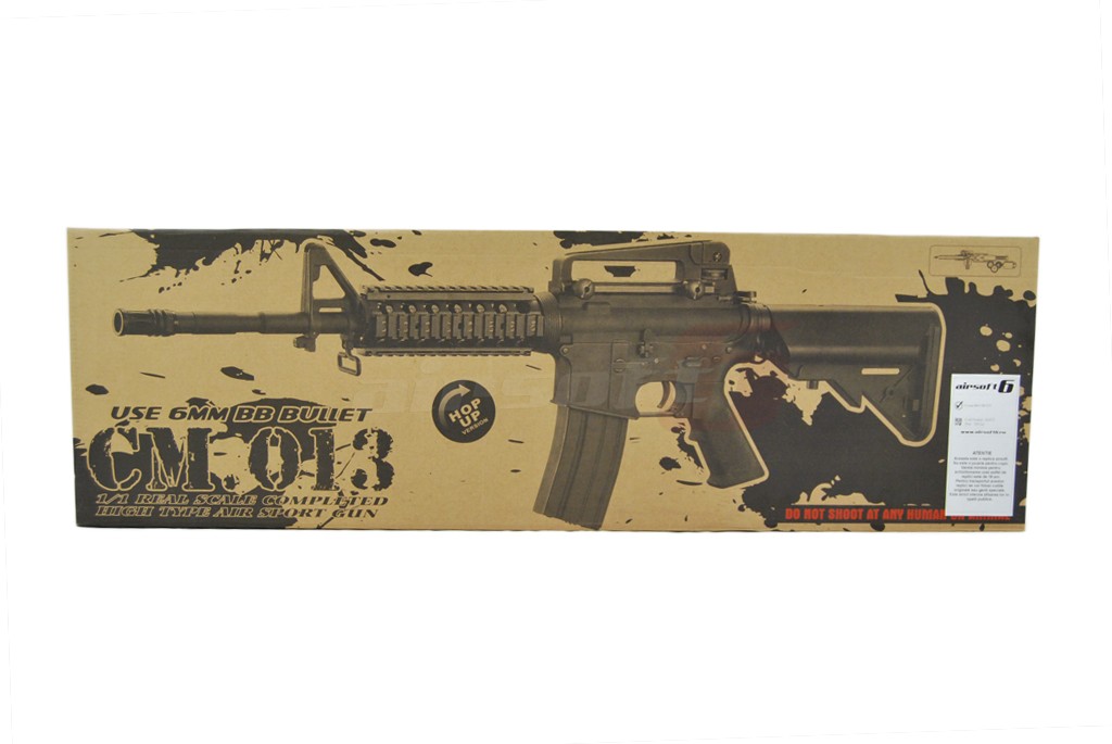 Asadar, va prezentam replica de airsoft M4 fabricata de Cyma model CM 013. Corpul replicii este din plastic ABS de calitate iar elementele de imbinare si accesoriile sunt din metal. Jucaria este dotata cu sine de 22mm in partea frontala pentru a putea atasa accesorii cum ar fi lanterna sau laser sau sisteme de ochire avansate. Calitatea finisajelor sunt de remarcat dat fiind segmentul din care fac parte aceste jucarii minunate. Asamblarea este buna iar materialele folosite sunt calitative.