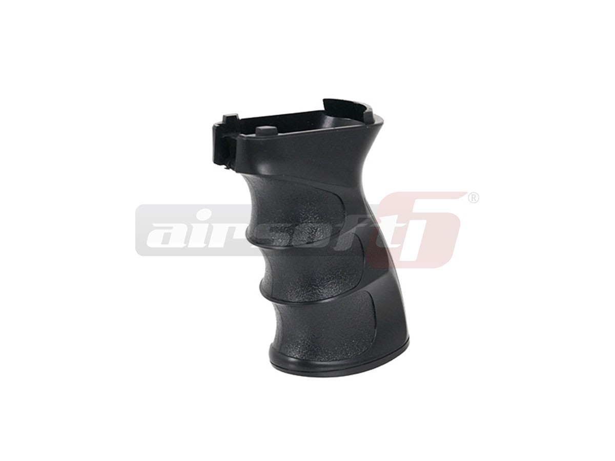 Pistol grip destinat platformelor AK . Manerul este fabricat in totalitate din plastic ABS de calitate iar montarea se realizeaza intocmai precum manerul original fixanduse cu ajutorul surubului din capat. Atentie la montare, trebuie tinut cont de aranjamentul cablurilor motorului. Folosind acest maner, prinderea utilizatorului este mai ferma astfel replica devenind mai usor de manevrat.
