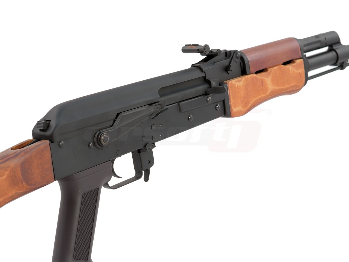 Corpul armei este fabricat din tabla otelita nituita. Asamblarea replicii de airsoft este asemanatoare cu cea reala. Producatorul a copiat arma reala, pastrand autenticitatea tipurilor de materiale cat mai mult posibil. Corpul CYMA este asamblat prin pini si sisteme de prindere prin presare. Fapt ce ofera corpului o robustele sporita. Aspect sustinut din plin prin folosirea unor materiale de calitate. Accesoriile replicii, ulucul si matul sunt fabricate din lemn multistrat. In partea frontala exista un sistem de sustinere rabatabil. Patul replicii difera de varianta AK47 ca si marime, permitand mai mult loc pentru acumulator.