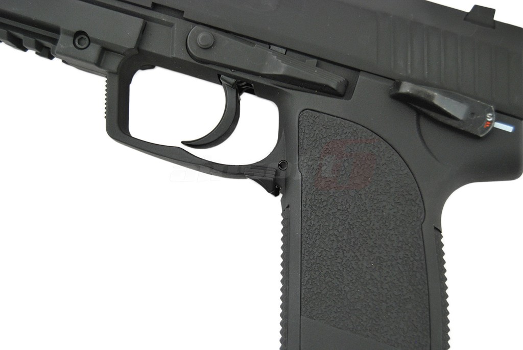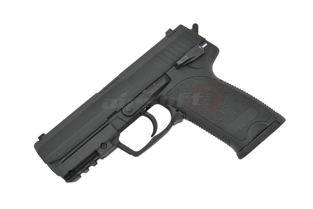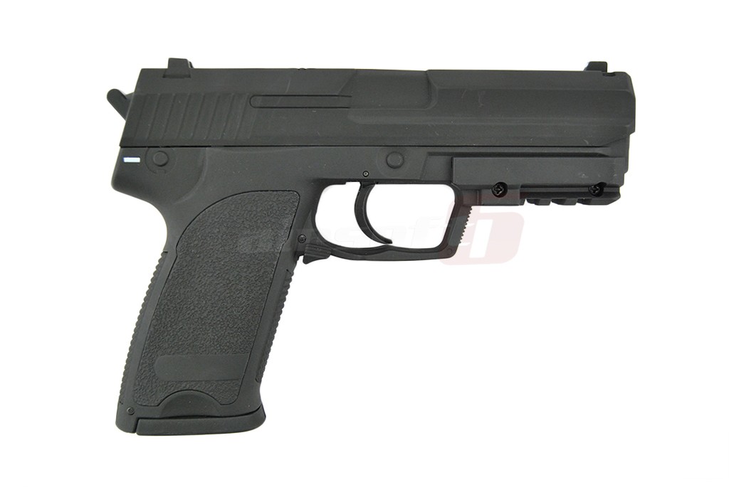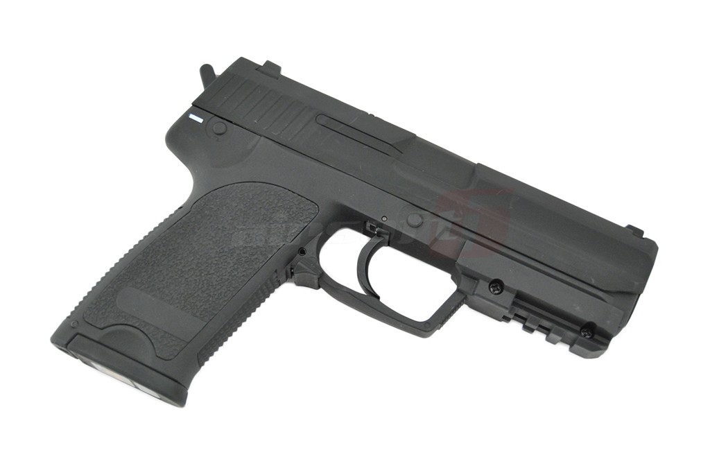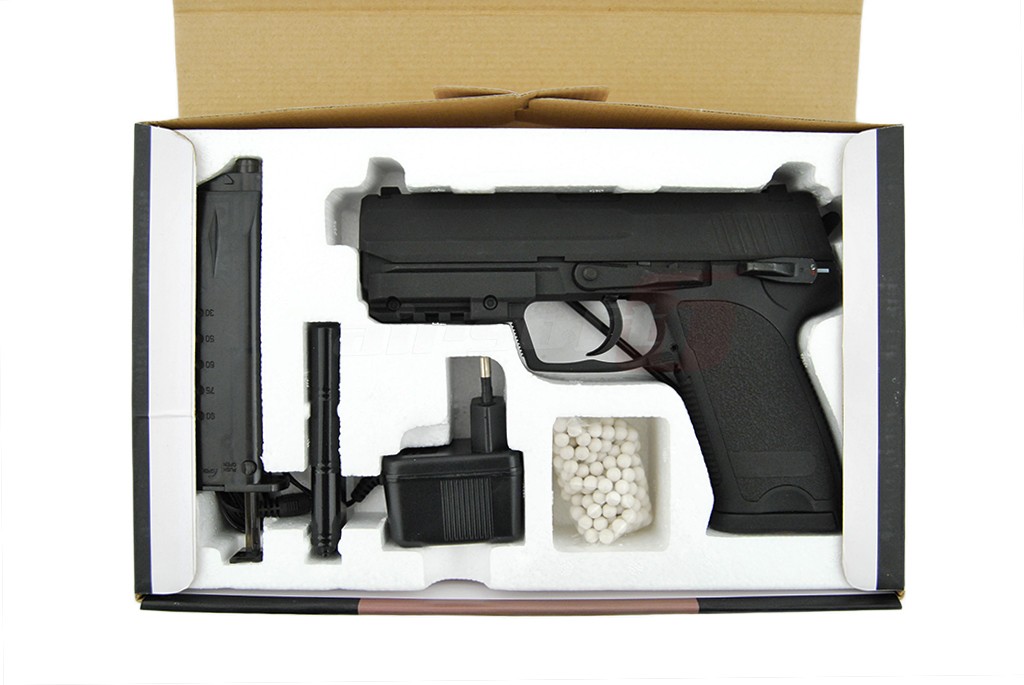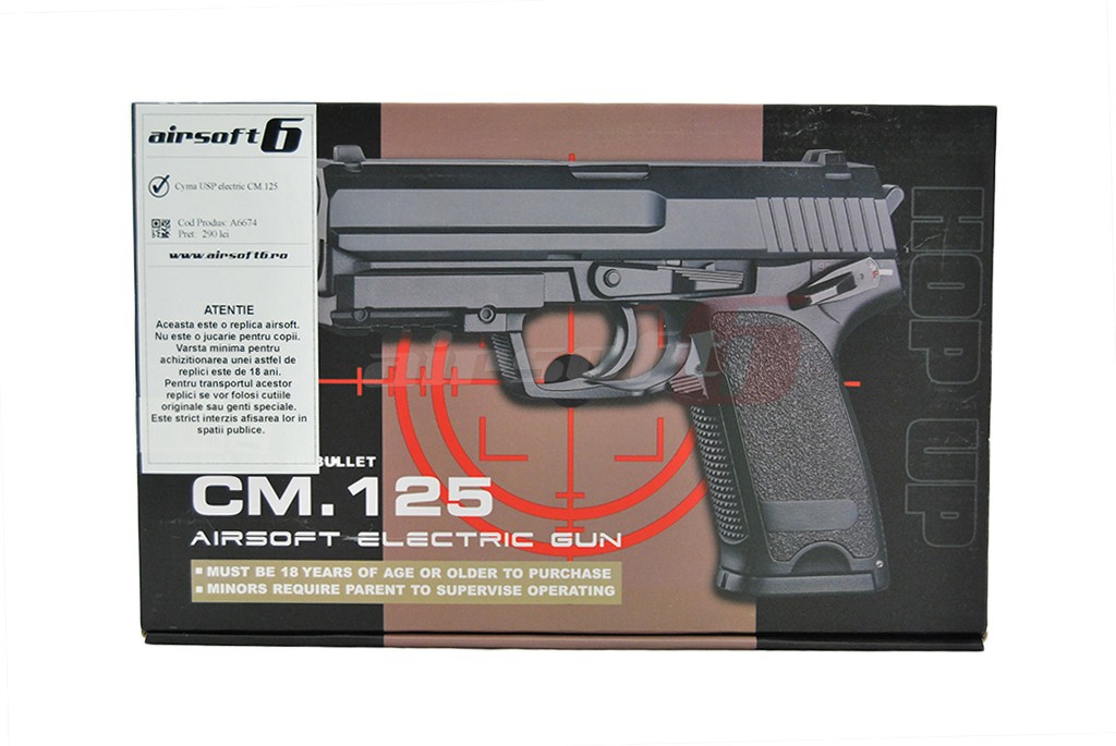 Aceasta replica de airsoft fabricata de Cyma la prima vedere prezinta un pistol USP autentic, la primul contact in schimb ne dam seama ca ceva nu este intocmai cum ne-am fi asteptat. Acest lucru datorita factului ca este un pistol cu functionare electrica. In locul mecanismelor interne si a compartimentelor de inmagazinare a gazului, se afla un gearbox electric in miniatura capabil sa propulseze bilele din replica atat foc cu foc cat si foc automat.