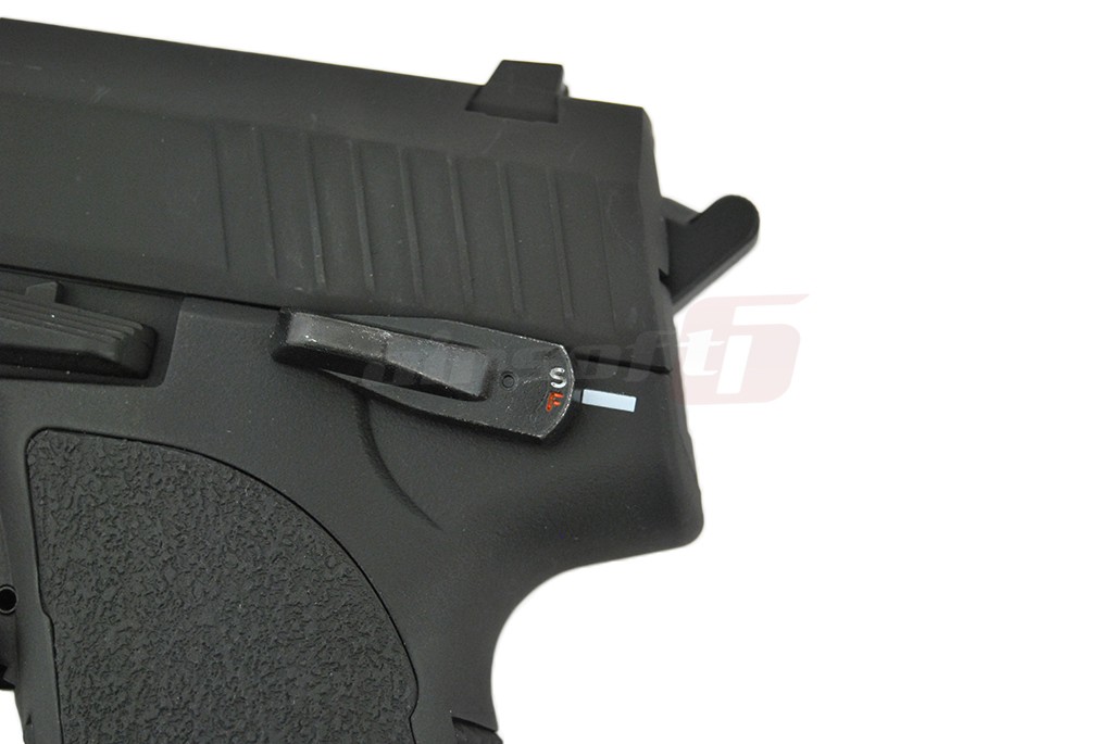 Exteriorul replicii de airsoft este construit din plastic ABS de calitate si metal in cazul slide-ului. Selectorul de tir este reprezentat de levierul ce in mod normal la pistolul adevarat foloseste la dezarmare si siguranta. (cel din stanga spate sus). Acest selector are 3 pozitii. Safe mod in care pistolul nu va trage Semi-Automat si Automat. Slide-ul replicii de airsoft nu culiseaza in nici un fel el fiind defapt un capac protector pentru interne. Pentru indepartarea Slide-ului trebuie pur si simplu actionat cocosul pistolului dupa care slide-ul poate fi indepartat in sus. Incarcatorul este mic si subtire, total nerealist dar prezinta un mare avantaj: poate inmagazina 30 de bile de 6mm.