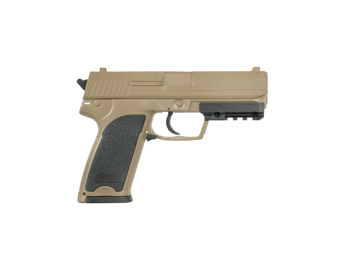 Aceasta replica de airsoft fabricata de Cyma la prima vedere prezinta un pistol USP autentic, la primul contact in schimb ne dam seama ca ceva nu este intocmai cum ne-am fi asteptat. Acest lucru datorita factului ca este un pistol cu functionare electrica. In locul mecanismelor interne si a compartimentelor de inmagazinare a gazului, se afla un gearbox electric in miniatura capabil sa propulseze bilele din replica atat foc cu foc cat si foc automat.