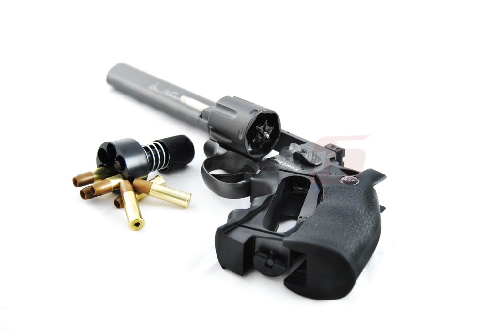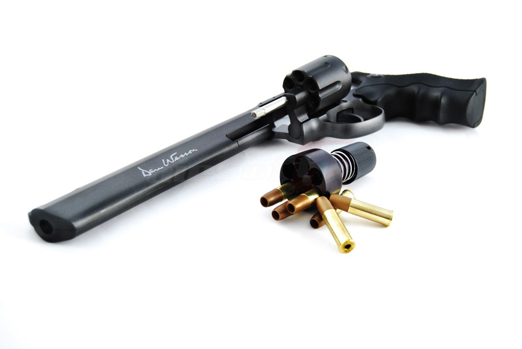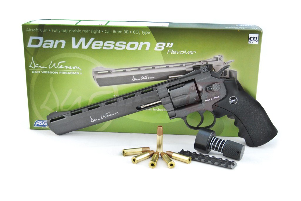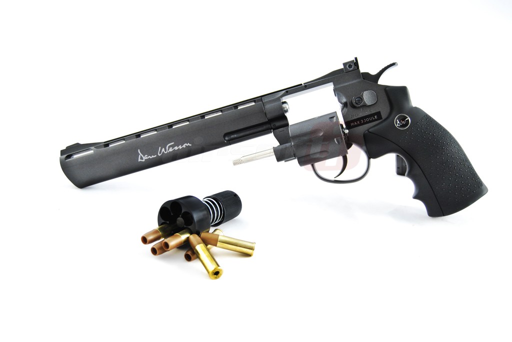 Dan Wesson 8 inch, aproape imposibil sa nu fi auzit cel putin odata de aceasta bestie. Un pistol superb dedicat coelctionarilor si nu numai. Principiul de functionare este principiul revolverului iar ca sursa de gaz este folosit CO2-ul. Incarcatorul pistolului este reprezentat de cartusele false din alama cu varf din plastic care pot stoca cate o bila de 6mm fiecare, astfel cu un total de 6 bile incarcate, nu este un pistol tocmai gata de actiune pe terenul de joaca. In shimb este foarte recomandat pentru tir sportiv. Senzatia oferita de manuirea acestei replici este cat se poate de asemanatoare cu cea a folosirii unui revolver adevarat. In pachet este inclusa o sina de 22 mm ce se poate monta pe partea superioara pentru a putea monta un dispozitiv de ochire avansat.