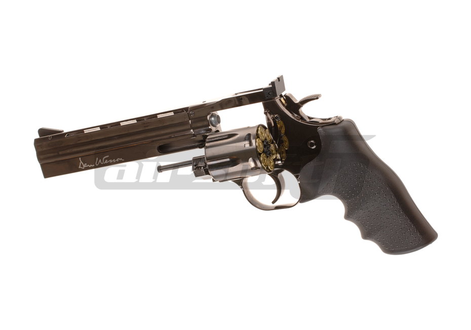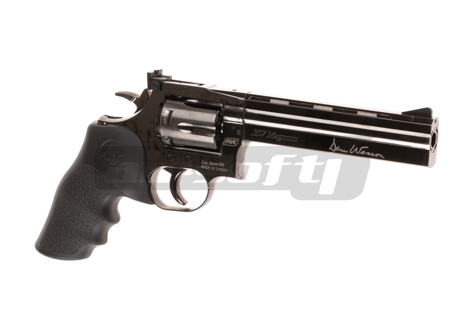 Dan Wesson 715 6 inch, un pistol superb dedicat colectionarilor si nu numai. Principiul de functionare este principiul revolverului iar ca sursa de gaz este folosit CO2-ul. Incarcatorul pistolului este reprezentat de cartusele false din alama cu varf din plastic care pot stoca cate o bila de 6mm fiecare, astfel cu un total de 6 bile incarcate, nu este un pistol tocmai gata de actiune pe terenul de joaca. In shimb este foarte recomandat pentru tir sportiv. Senzatia oferita de manuirea acestei replici este cat se poate de asemanatoare cu cea a folosirii unui revolver adevarat.