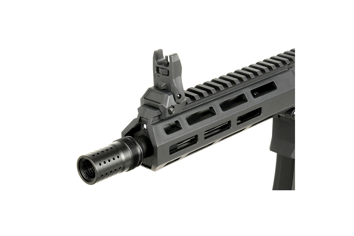 Stim prea bine ca manevrabilitatea buna si confortul tinerii armei in mana sunt doua lucruri esentiale pe terenul de joaca. Acum poti uita de oboseala datorata manevrarii replicilor, datorita utilizarii de nailon armat, in loc de aliaje metalice, care reduce considerabil greutatea. Tot pentru confortul tau, replica este prevazuta cu un maner din ABS texturat, facilitand o prindere mai buna.