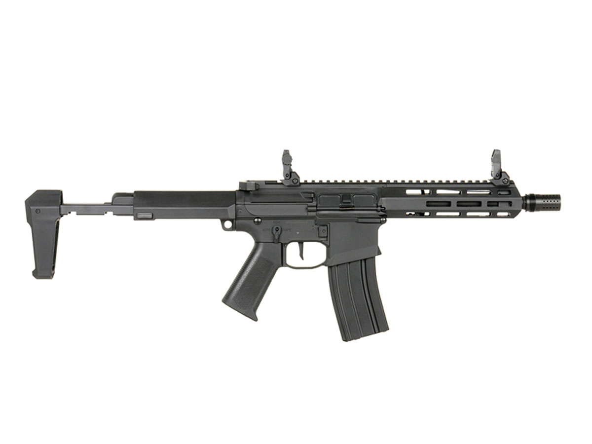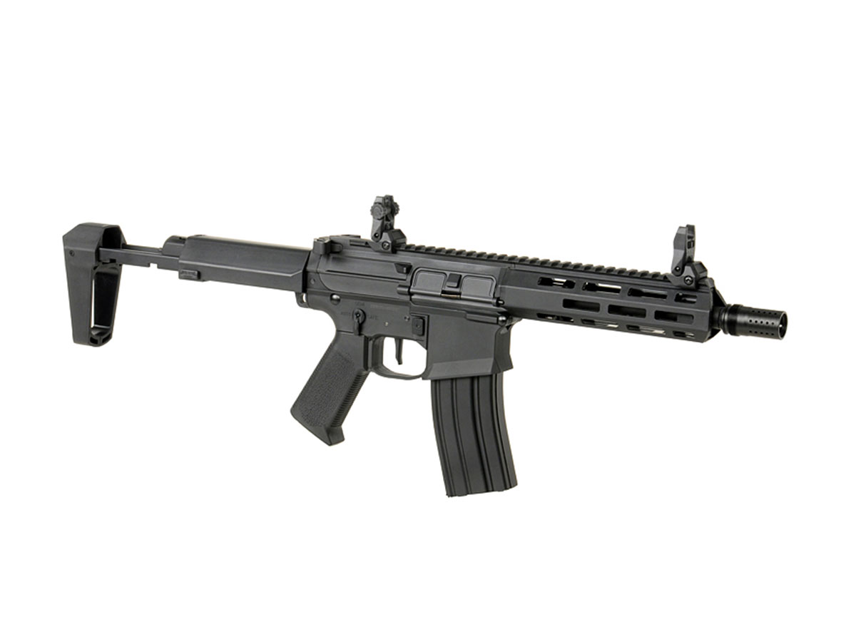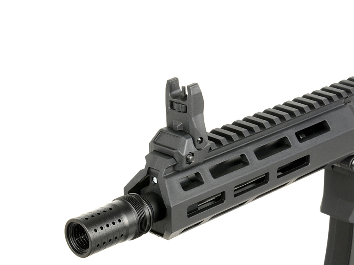 Stim prea bine ca manevrabilitatea buna si confortul tinerii armei in mana sunt doua lucruri esentiale pe terenul de joaca. Acum poti uita de oboseala datorata manevrarii replicilor, datorita utilizarii de nailon armat, in loc de aliaje metalice, care reduce considerabil greutatea. Tot pentru confortul tau, replica este prevazuta cu un maner din ABS texturat, facilitand o prindere mai buna.