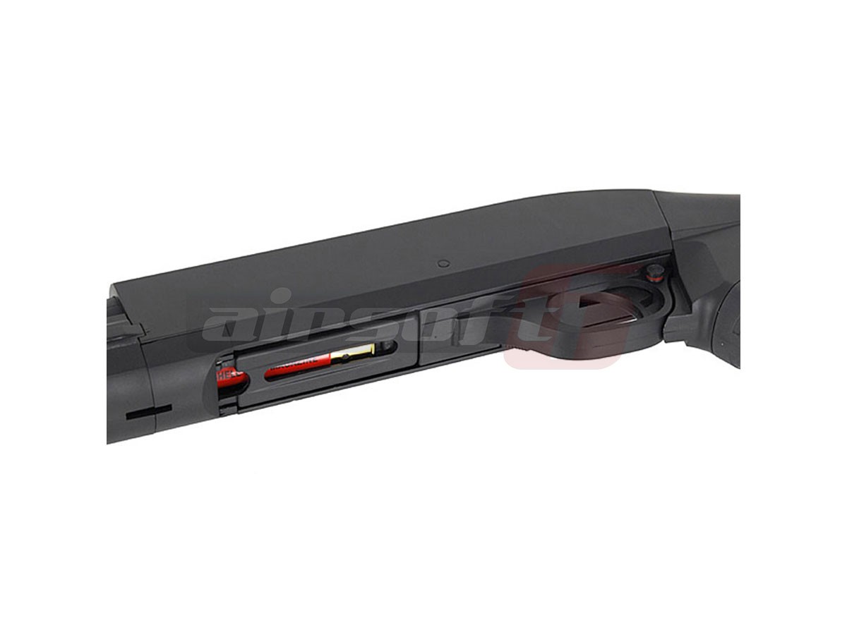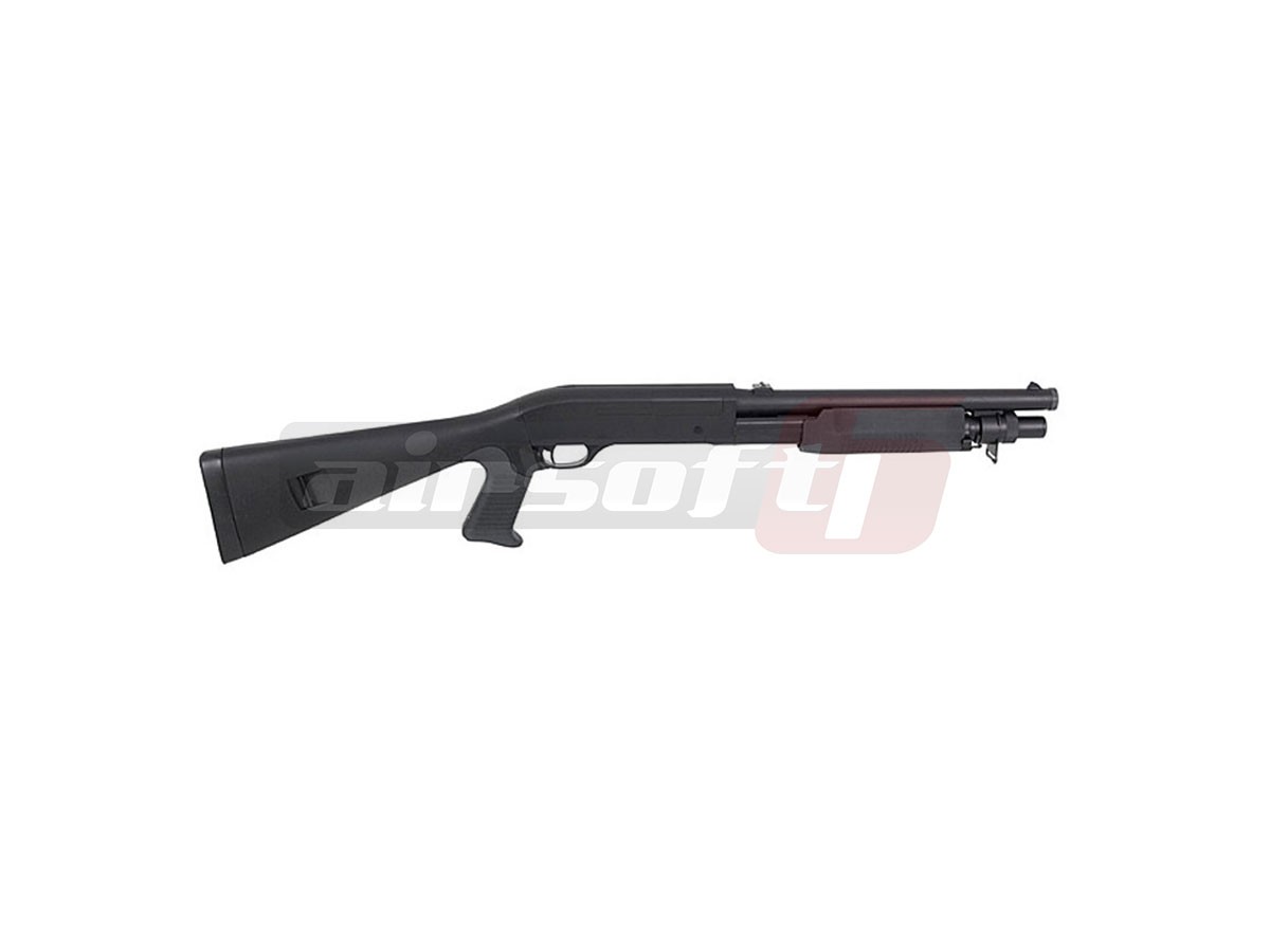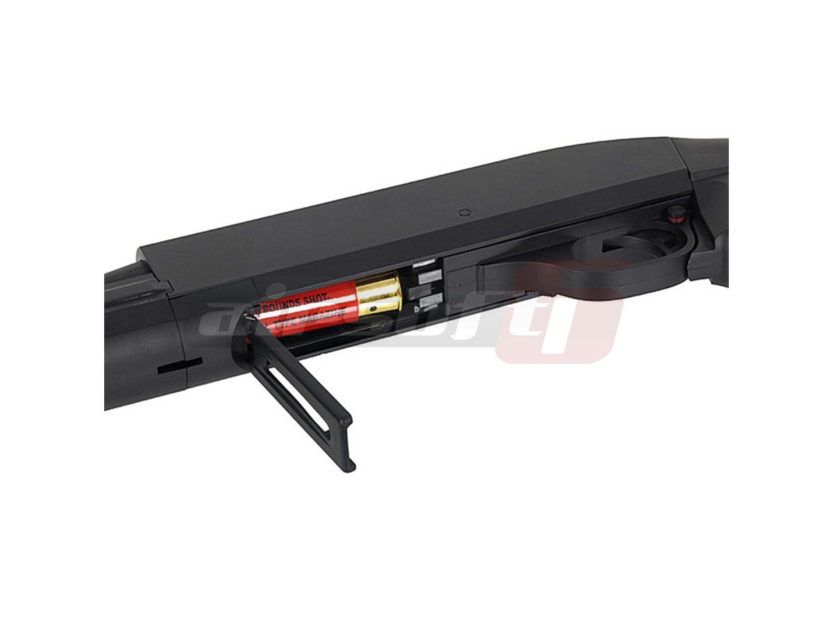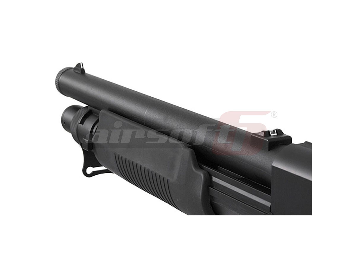 Replica de airsoft Double Eagle M56A este varianta cu pat a lui Mossberg 590, este construita aproape in intregime din plastic avand scutul protector superior din metal perforat. Materialul predominand fiind plasticul costurile replicii sunt mici. Functionalitatea replicii de airsoft este asemanatoare armei adevarate: piedica este localizata deasupra tragaciului iar pentru fiecare foc trebuie armat cu ajutorul mansonului frontal. Aceasta actiune ofera o senzatie de autenticitate in momentul folosirii.