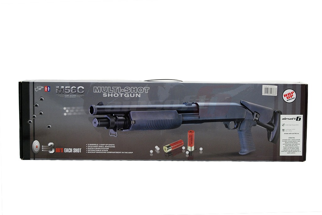 Replica de airsoft M56C permite fata de un shotgun clasic pentru fiecare armare 3 bile, fiecare pe o teava separata gata sa fie trase simultan la apasarea tragaciului, facand astfel mai usoara abordarea unor tinte multiple. Grupajul celor 3 bile este bun ele calatorind destul de apropiat. Aceasta replica de airsoft este construita predominant din plastic, tevile frontale sunt din aluminiu iar manerul, patul si armatorul sunt acoperite cu un strat cauciucat pentru o mai buna aderenta. Patul replicii este reglabil. Pentru a putea extinde patul este necesar apasarea butonului lateral si inclinarea patului spre dreapta replicii la un unghi de 45'.
