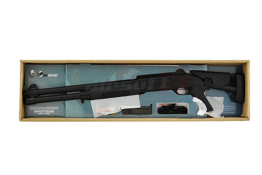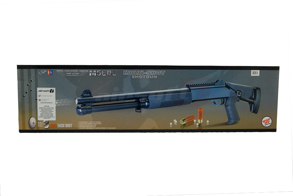 Replica de airsoft construita de Double Eagle copiaza exteriorul cunoscutului M4 dar limitandu-se la functia manuala. Avantajul replicii M56DL fata de un shotgun clasic este ca pentru fiecare armare sunt pregagite 3 bile fiecare pe o teava separata gata sa fie trase simultan la apasarea tragaciului. In acest fel este mai usor abordarea unor tinte multiple. Grupajul celor 3 bile este bun ele calatorind destul de apropiate. Replica de airsoft este construita predominant din plastic, tevile frontale sunt din aluminiu iar manerul, patul si armatorul sunt acoperite cu un strat cauciucat pentru o mai buna aderenta. Patul replicii este reglabil. Pentru a putea extinde patul este necesar apasarea butonului lateral si inclinarea patului spre dreapta replicii la un unghi de 45'.