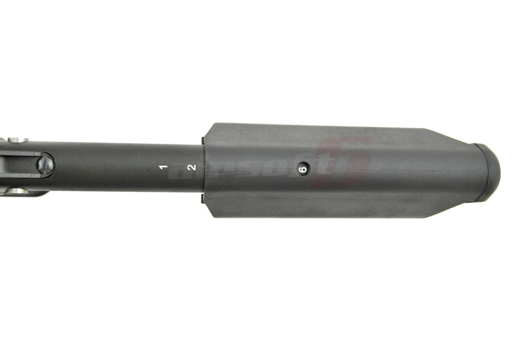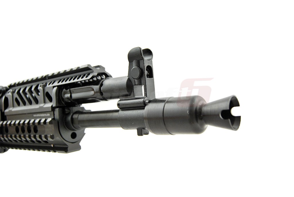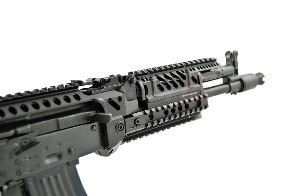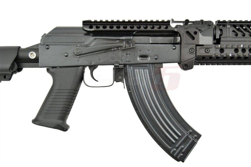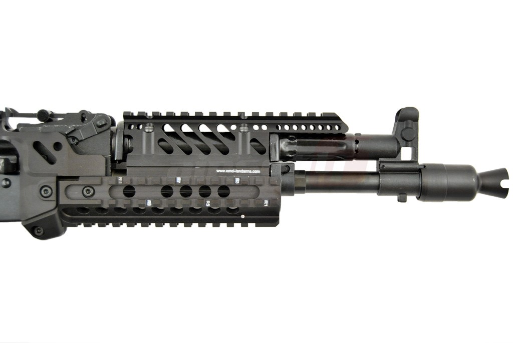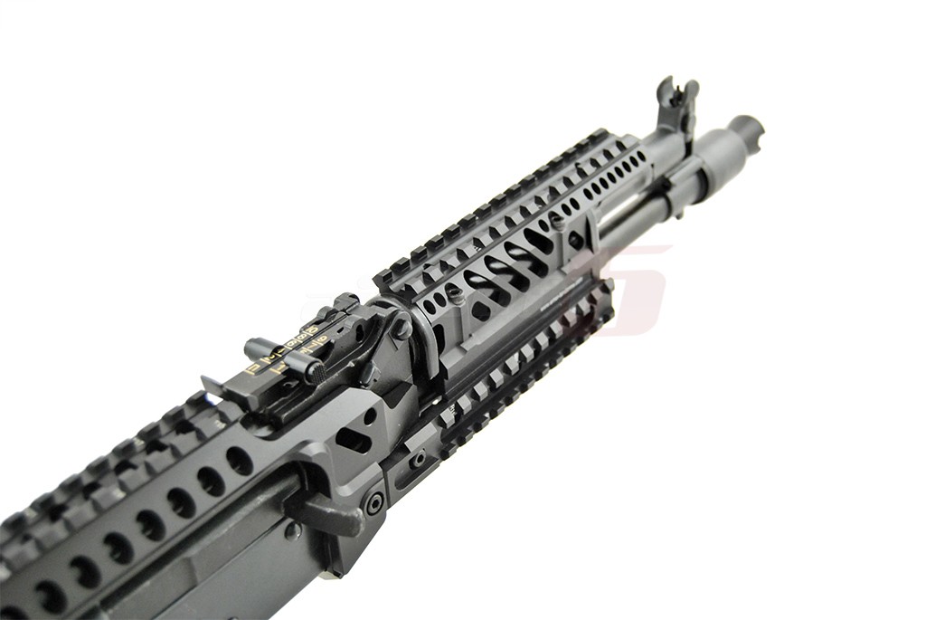 Centrul de greutate este usor spre fata datorita sistemului de sine. Acest sistem permite o vasta accesorizare. Exista o sectiune de sine chiar deasupra capacului superior pentru a putea monta dispozitive optice intr-o pozitie mai confortabila. Corpul replicii de airsoft este fabricat din tabla otelita groasa, nituita. Marcajele sunt stantate. Partile de imbinare ale replicii de airsoft sunt fabricate din otel de calitate contribuind la o mai buna rezistenta. Manerul replicii de airsoft este de tip SAW, oferind o prindere excelenta iar patul este de tip SOPMOD reglabil cu 6 pozitii. In partea din spate exista sistem de prindere a curelei cu detasare rapida. Atentie in pachet nu este inclus si inel pentru prindere rapida. Incarcatorul replicii de airsoft este fabricat din tabla otelita.