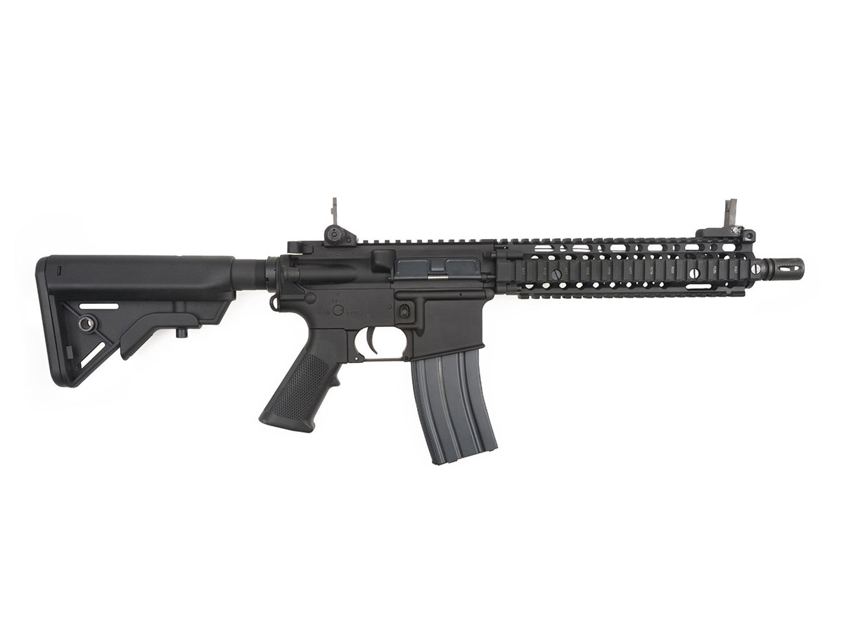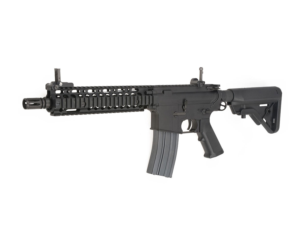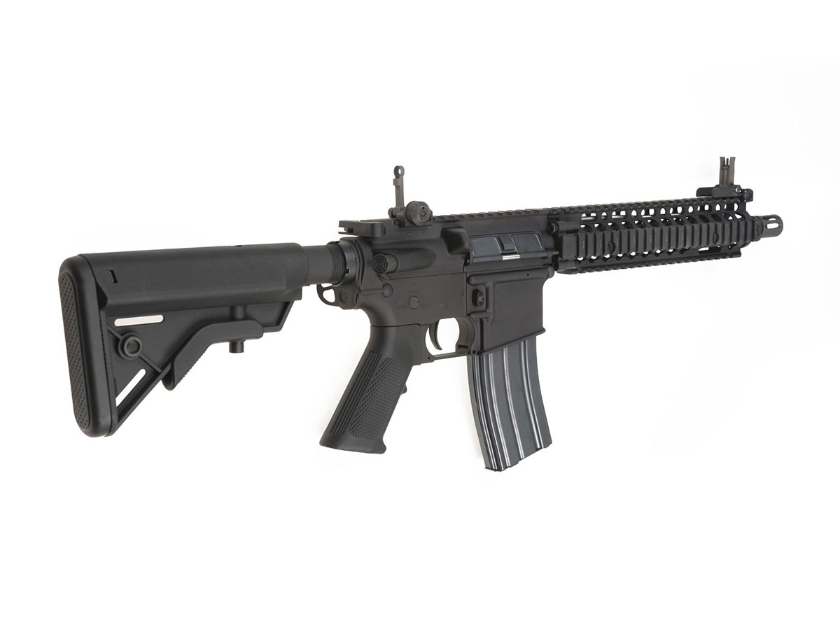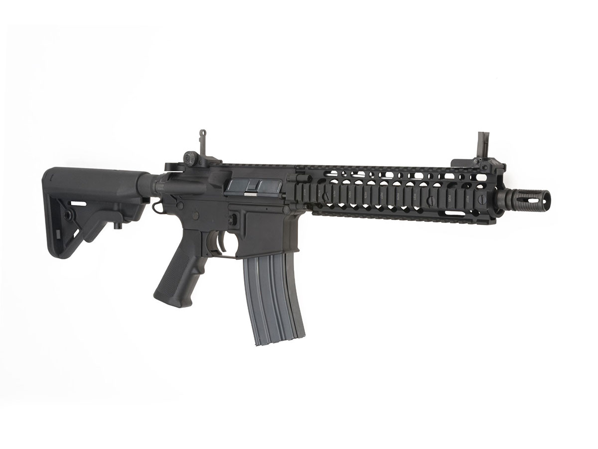 Replica ELAR MARK 18 MOD1 apartine seriei Platinum, oferita de E&L. Realismul replicii este dat de metalul din constructia corpului, a tevii exterioare si a incarcatorului. Patul si manerul sunt realizate din plastic ABS, conform armei reale. Ulucul prevazut cu sine RIS pe toate partile, plus sina RIS superioara aditionala, permit o accesorizare vasta, astfel iti poti personaliza arma in cel mai extravagant mod.