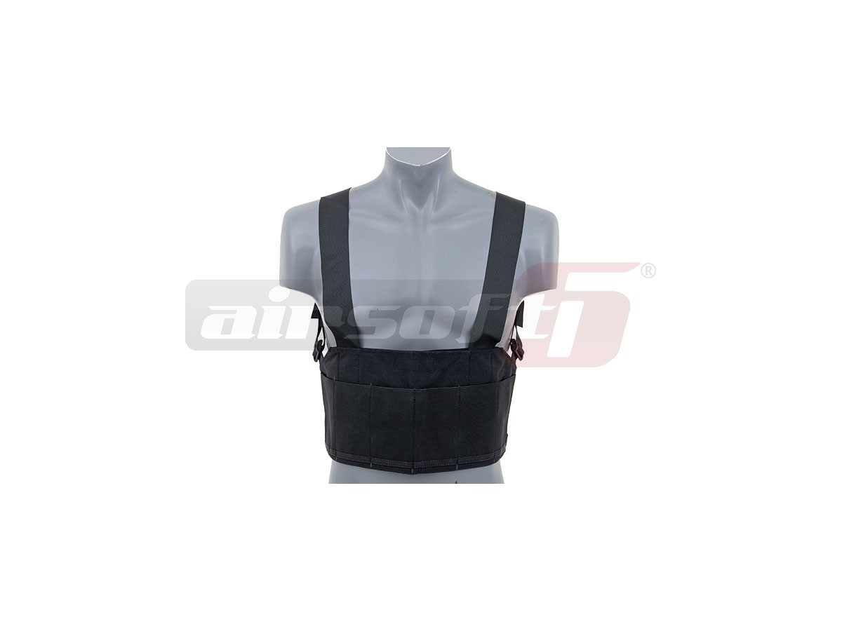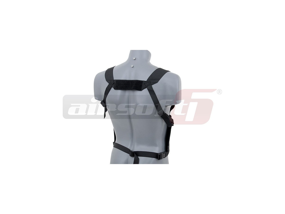 Acest Chest Rig oferit de Emerson reprezinta un sistem de transport al incarcatoarelor pentru replicile de airsoft si cam atat. Este realizat din nylon si material elastic. El poate transporta 6 incarcatoare de dimensiuni medii si se asigura cu ajutorul unor bretele reglabile. Ideea este sa poti transporta incarcatoarele in alta parte decat buzunarele vestonului sau ale pantalonilor si totodata sa fie la indemana pentru o reincarcare rapida. In partea din spate exista o sectiune de scai pe care pot fi montate patchuri sau alte inseme prevazute cu acest sistem de asigurare.