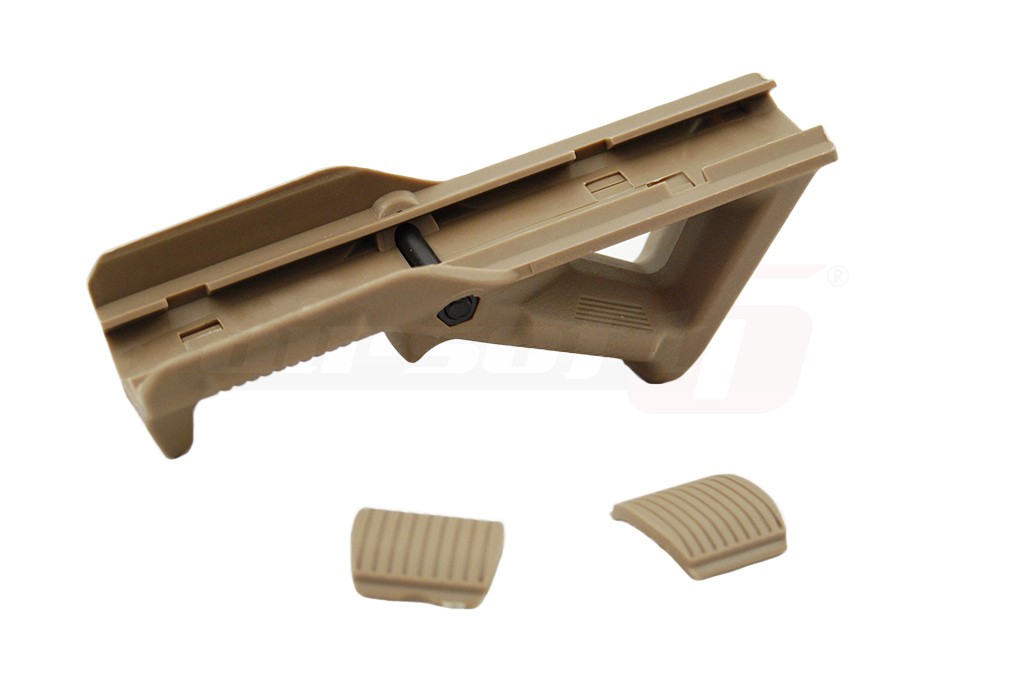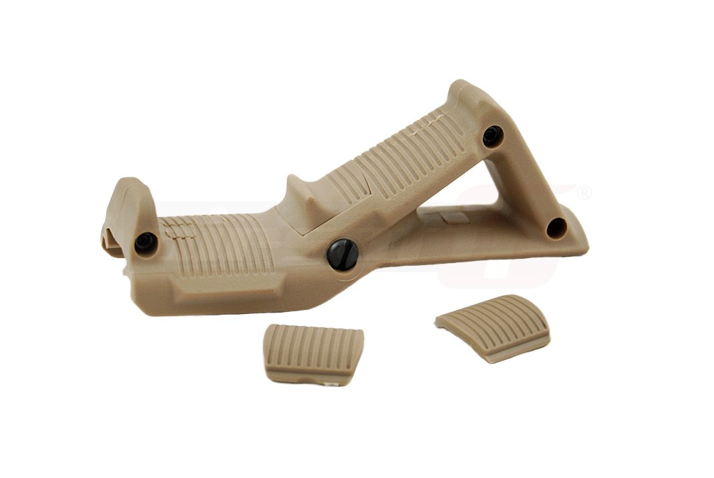 Acesta este un maner frontal unghiular fabricat din plastic ABS. Sistemul de prindere si asigurare este din metal. Acest maner poate imbunatati mult confortul utilizatorului in momentul exploatarii si controlului replicii. Acest maner se poate monta pe sine standard de 22mm si asigurarea se face cu un surub mare ce trebuie centrat in canalele sinei pe care urmeaza a fi montat. In pachet este inclus un capac menit sa inlocuiasca pintenul in functie de preferintele utilizatorului. Pentru al inlocui este necesara demontarea manerului.