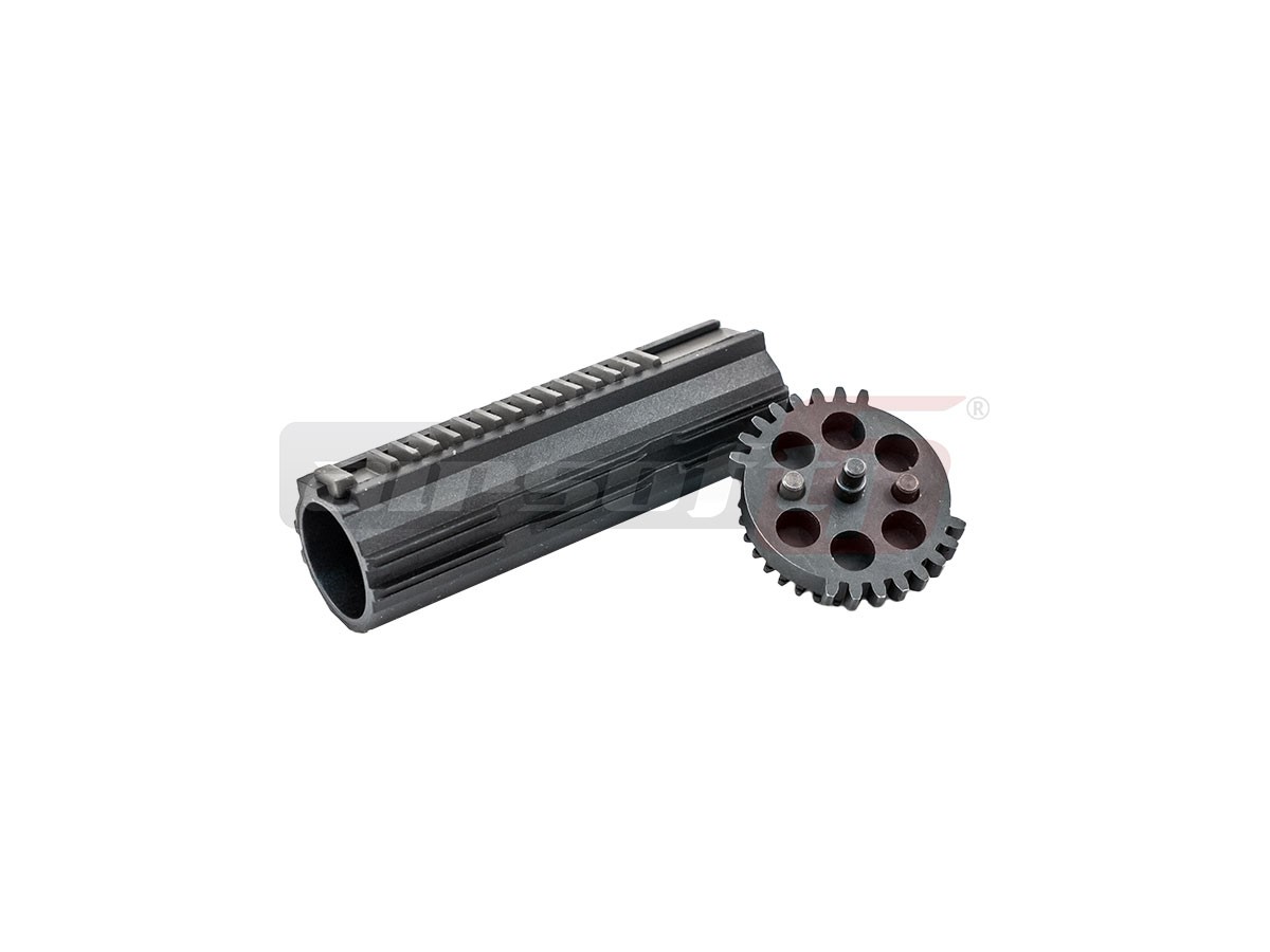 Set Roata sectoare si piston cu dinti din otel. Roata sectoare este cea care permite circuitul cicluc al replicilor de airsoft electrice, cu ajutorul dintilor ce angajaza pistonul pozitionati doar pe jumatate din circumferinta rotii. Roata de fata este prevazuta cu 2 randuri de dinti ce angajeaza pistonul rezultand o cadenta mult mai mare decat in cazul unei roti normale. Pentru a putea exploata corect aceasta roata este nevoie de cunostinte avansate in domeniul tehnologic airsoft-istic. Pe scurt, va trebui folosit cu piston cu dintii din metal si un arc mult mai puternic pentru a compensa distanta mai scurta pe care pistonul trebuie sa o parcurga. Roata este confectionata din otel si este prevazuta cu 2 randuri de came pentru tappet plate si cut off lever.