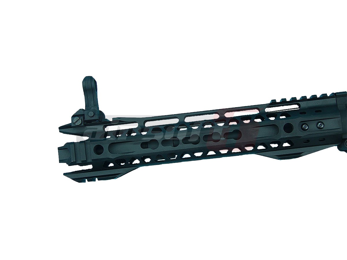 Sistemul frontal de sine de tip free float este dotat atat cu sectiuni picatinny cat si keymod, permitand astfel o vasta accesorizare a replcii; lanterne, lasere, manere, ornamente dar si altele. In pachet exista un sistem clasic de ochre, reglabil si rabatabil realizat din plastic ABS. Replica este construita in intregime din aluminiu de calitate usurand astfel greutatea totala a replicii de airsoft. Vopseaua folosita este una speciala rezistenta la uzura. Patul este retractabil cu 5 pozitii de reglaj fabricat din plastic ABS.