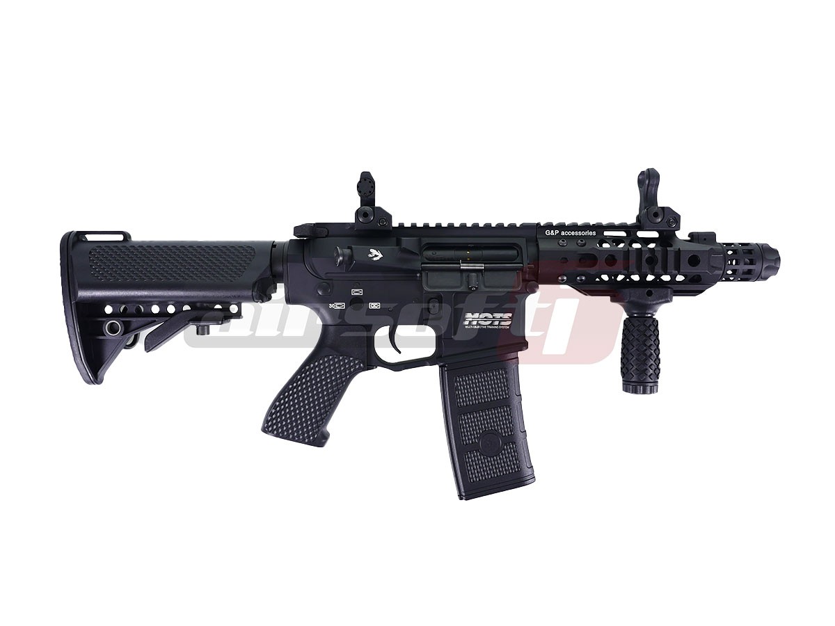 Gearboxul replicii de airsoft este versiune 2 prevazuta cu rulmenti de 8 mm din otel de calitate. Interiorul gearboxului este foarte atent prelucrat; rotile sunt fabricate dintr-un metal dur si rezistent la uzura, shimingul este foarte bine pus la punct. Capul de cilindru este din aluminiu deasemenea ca si nozzle-ul care este prevazut la randul lui cu o-ring de etansare. Cilindrul este portat specific G&P, adica alezat in interior spre capatul opus evacuarii. Bilele actionate au o viteza de aprox 90-95 m/s masurata cu bile de 0.20g