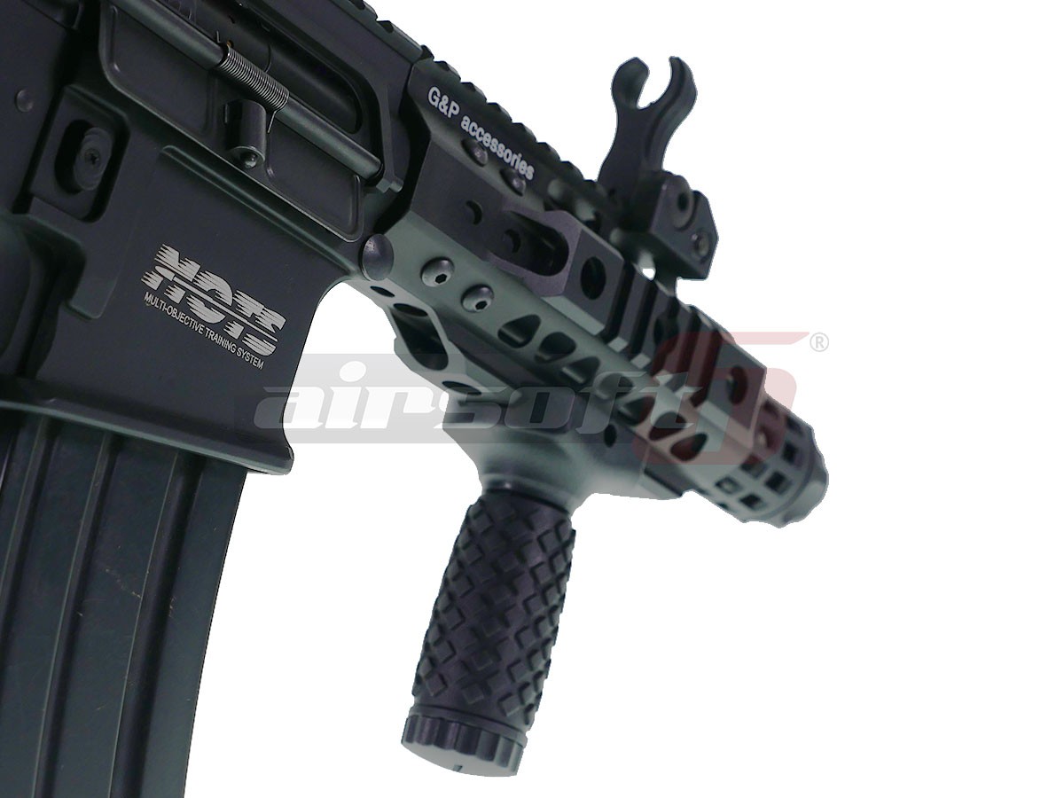 Pentru o prindere cat mai ferma producatorul a inclus in pachet si un maner vertical, ce se fixeaza ferm pe pozitie. Replica de airsoft este prevazut cu 2 prinderi de tip QD, una in partea din spate a patului si una in partea din fara a sistemului de sine.