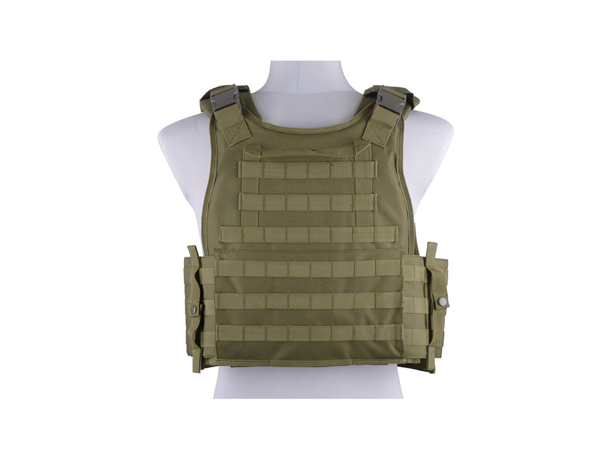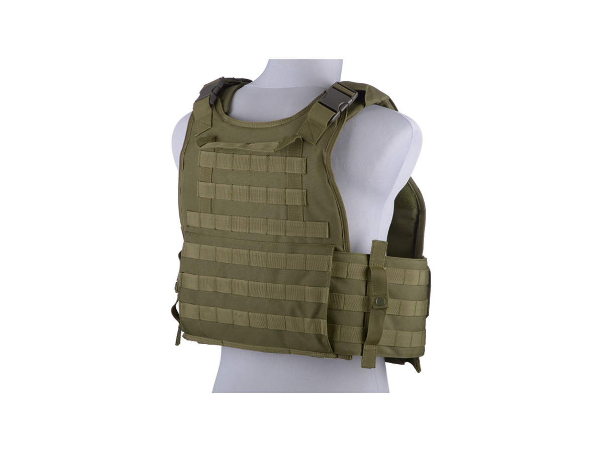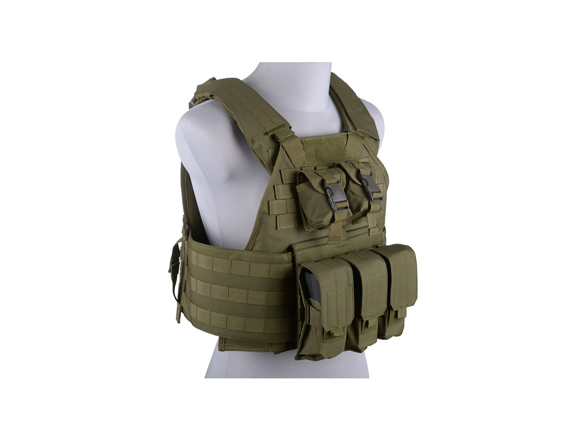 Acest plate carrier tactic Olive oferit de GFC este destinat pentru cei slabi de inger care cred cu desavarsire sa o bila de airsoft poate sa lezeze vre-un plaman sau splina. In afara de capabilitatile unei veste tactice prevazute cu sistem de prindere al accesoriilor molle, ea este prevazuta cu 3 buzunare pentru incarcatoarele principale si 2 pentru grnade. Vesta este fabricata din nylon 600D de calitate, foarte rezistent la uzura si umezeala.