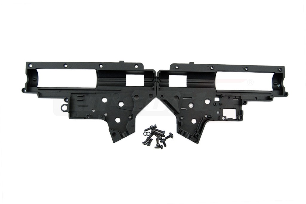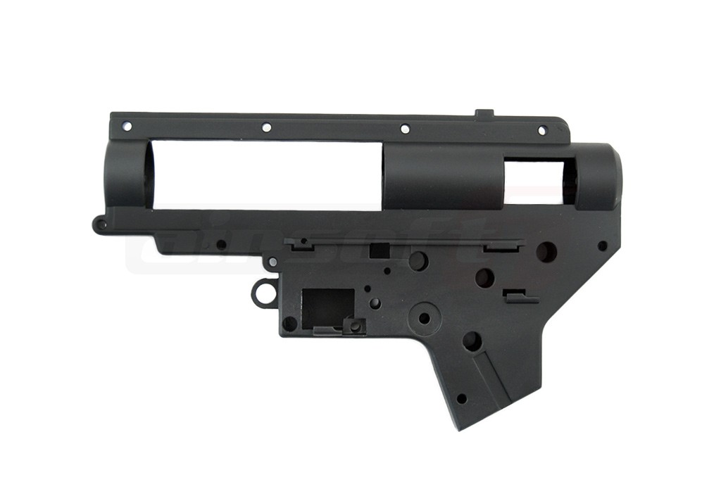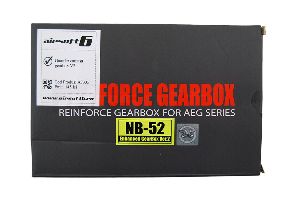 Carcasa destinata replicilor cu functionare electrica prevazute cu gearbox versiune 2. Aceasta carcasa fabricata de Guarder ofera un raport calitate pre bun. Este fabricata din aliaj de zinc fiind astfel rezistenta si totodata usoara. Peretii carcasei sunt mai grosi decat a majoritatii carcaselor cu care sunt prevazute replicile AEG atunci cand vin de la producator. Aceasta carcasa reprezinta o componente cheie in upgrade-urile de calitate. Axialitatea orificiilor pentru bucse, ramforsarile in locuri cheie si in primul rand materialul din care este fabricata. Aceasta carcasa este prevazuta cu orificii de 6mm destinate bucselor.
