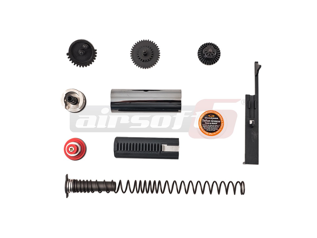 Acesta este un set complet de piese interne oferit de Guarder, destinat gearbox-ului versiune 2 standarddestinat platformelor AEG model AK. In majoritatea cazurilor componentele din interiorul gearbox-ului standard sunt de calitate mediocra, nefiind capabile sa ofere fiabilitate atunci cand sunt supuse usor puteri marite sau cadente imbunatatite. Cu ajutorul acestui set este posibila obtinerea unor performante imbunatatite fata de cele standard, datorita calitatii superioare ale materialelor utilizate in fabricarea acestor componente. Astfel, odata montat acest set, gearbox-ul va putea sustine mai fiabil o putere mai mare de foc sau o cadenta marita. Se recomanda analiza corecta a geabox-ului existent pentru a deduce daca aceste componente sunt 100% compatibile. Acest set este proiectat sa se potriveasca pe toate platformele standard V3 T.M.