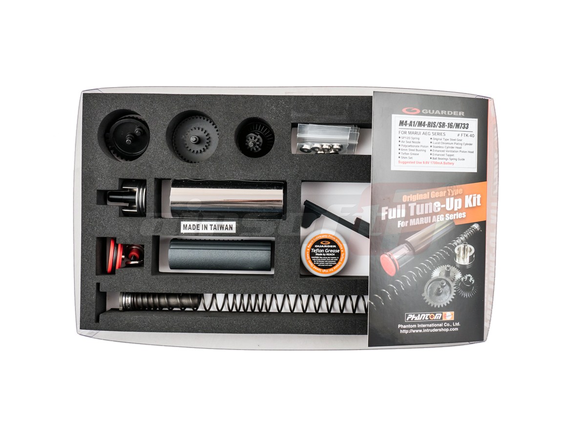 Acesta este un set complet de piese interne oferit de Guarder, destinat gearbox-ului versiune 2 standarddestinat platformelor AEG model M4. In majoritatea cazurilor componentele din interiorul gearbox-ului standard sunt de calitate mediocra, nefiind capabile sa ofere fiabilitate atunci cand sunt supuse usor puteri marite sau cadente imbunatatite. Cu ajutorul acestui set este posibila obtinerea unor performante imbunatatite fata de cele standard, datorita calitatii superioare ale materialelor utilizate in fabricarea acestor componente. Astfel, odata montat acest set, gearbox-ul va putea sustine mai fiabil o putere mai mare de foc sau o cadenta marita. Se recomanda analiza corecta a geabox-ului existent pentru a deduce daca aceste componente sunt 100% compatibile. Acest set este proiectat sa se potriveasca pe toate platformele standard V2 T.M.