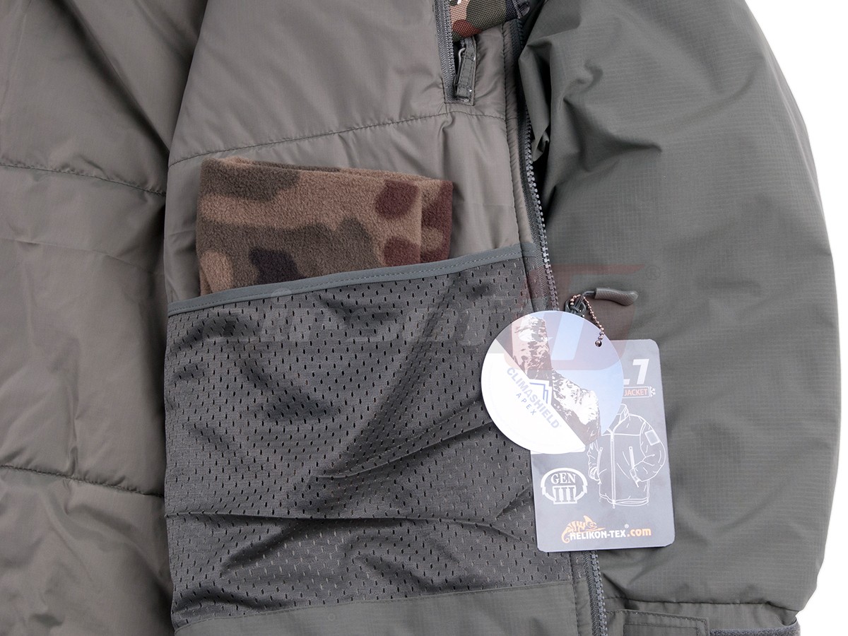 Geaca LEVEL 7 este, in acest moment, cea mai groasa geaca oferita de Helikon-Tex publicului. Producatorul a gandit acest articol vestimentar avand un scop principal si anume acela de a oferi protectie maxima impotriva frigului chiar si in cele mai aspre conditii de exploatare. Secretul acestei geci consta in primul rand in stratul de izolatie numit Climashield Apex. Acest material este capabil sa genereze si sa pastreze confortul termic optim chiar daca este uscat sau ud. In afara de propietatile uluitoare de izolatie, acest material este si extrem de usor, permitand astfel reducerea considerabila a greutatii intregului ansamblu. Exteriorul gecii este acoperit cu un strat subtire de nylon ramforsat ripstop, ce deasemenea ajuta la pastrarea greutatii reduse a gecii. Un aspect ce trebuie mentionat este posibilitatea de a compacta considerabil geaca atunci cand este impachetata, fara a periclita integritatea structurala a ei.