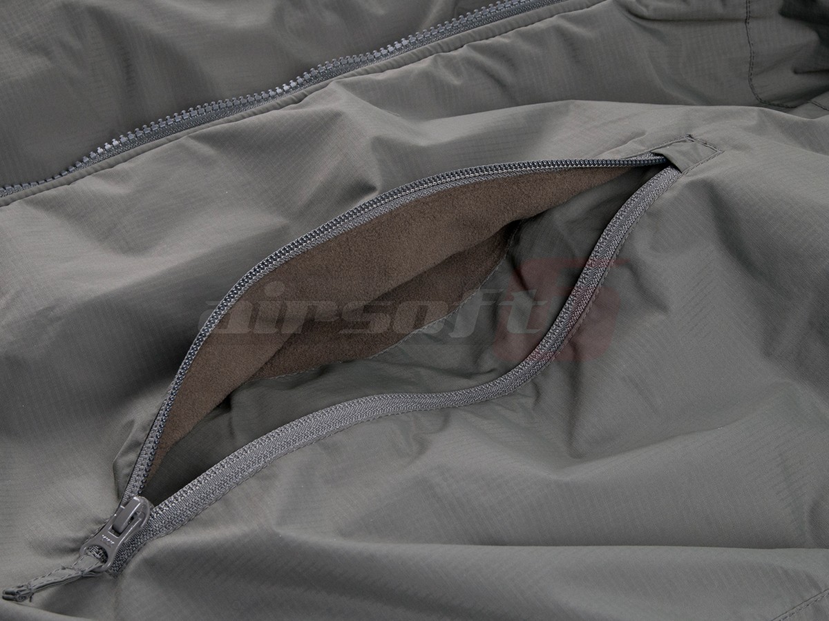 Buzunarele jachetei sunt; 2 buzunare foarte mari in partea din fata asigurate cu fermoar, compartimentate si captusite cu fleece, 1 buzunar in partea de sus a interiorului deasemenea asigurat cu fermoar si doua buzunare mari im partea de jos a gecii destinate uscarii echipamentelor. In partea de sus a bratelor exista sectiuni cu velro pentru montarea ecusoanelor sau a patch-urilor de identificare.