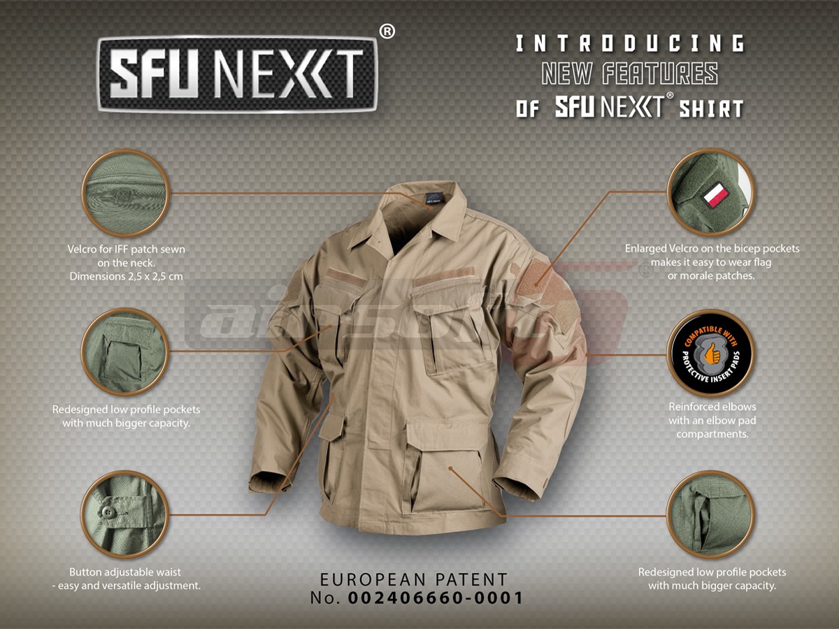 Acest veston reprezinta partea superioara a costumatiei Special Force Uniform NEXT generation. Tinuta SFU este un concept, menit sa intruneasca toate avantajele unei tinute militare moderne. Materialul utilizat si croiala ofera utilizatorului un randament bun in toate situatiile. Materialul utilizat este o combinatie intre Bumbac si Poliester mai exact 60% bumbac pentru confort si 40% poliester pentru a oferi rezistenta sporita materialului impotriva rupturilor. Buzunarele sunt numeroase si amplasate in locuri importante pentru un acces cat mai usor.