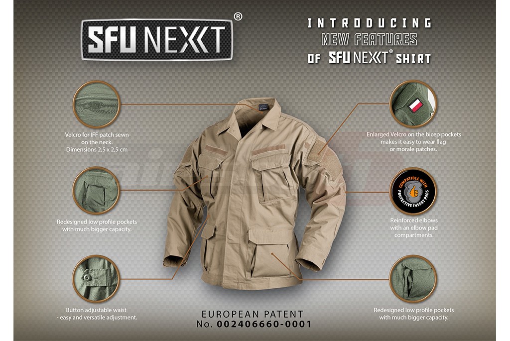 Acest veston reprezinta partea superioara a costumatiei Special Force Uniform NEXT generation. Tinuta SFU este un concept, menit sa intruneasca toate avantajele unei tinute militare moderne. Materialul utilizat si croiala ofera utilizatorului un randament bun in toate situatiile. Materialul utilizat este o combinatie intre Bumbac si Poliester mai exact 60% bumbac pentru confort si 40% poliester pentru a oferi rezistenta sporita materialului impotriva rupturilor. Buzunarele sunt numeroase si amplasate in locuri importante pentru un acces cat mai usor.