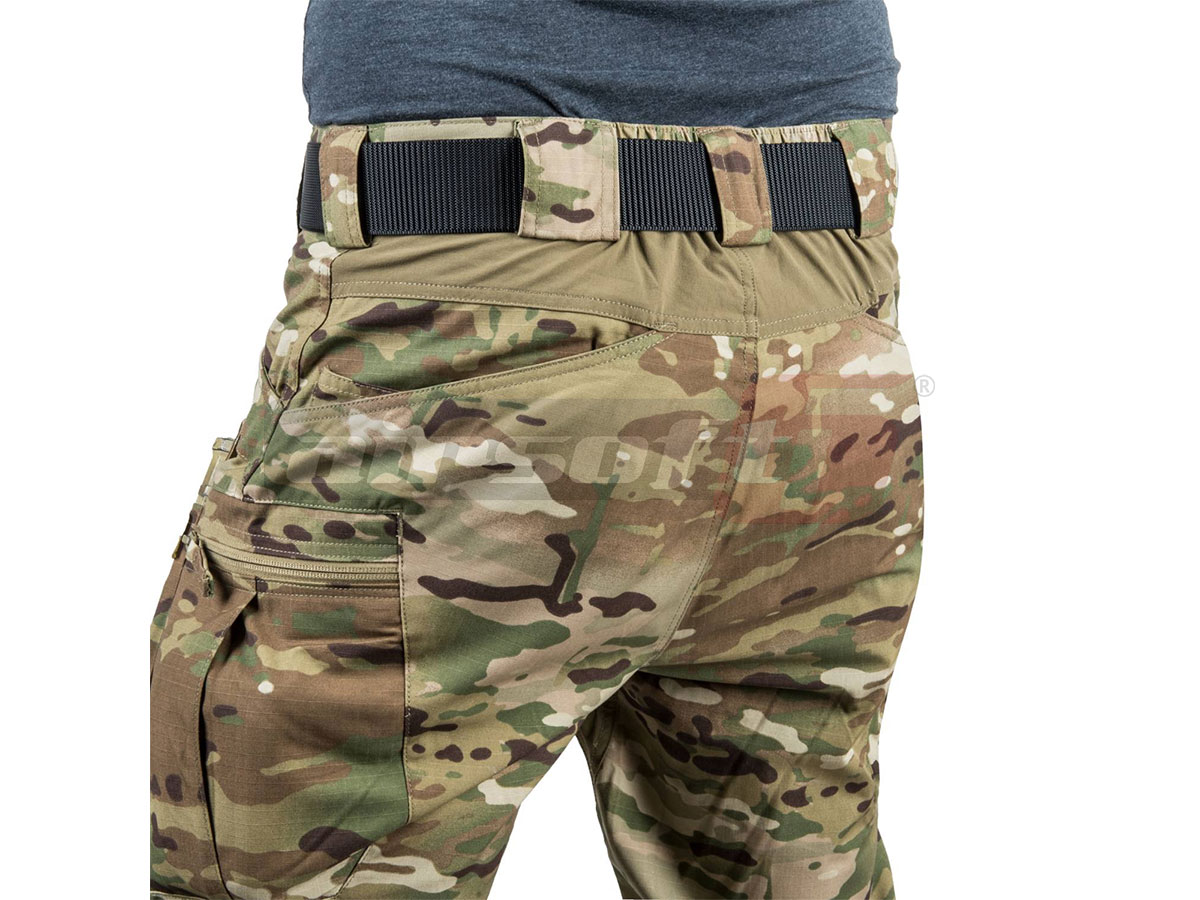 Pantalonii sunt prevazuti cu 7 gaici pentru curea pe toata suprafata taliei, pentru a putea asigura ferm centura in ideea accesorizarii acesteia. In partea din spate a taliei pantalonilor exista o sectiune elastica pentru fixarea pantalonilor. Gaicile din fata sunt prevazute cu sectiuni pentru a putea monta carabine. In zona genunchilor exista sectiuni atat in fata cat si in spate prevazute cu material aditional pentru a preveni uzura prematura. Partea dintre picioare si partea superioara a dorsalului sunt din material elastic in 4 directii pentru a permite o buna libertate de miscare.