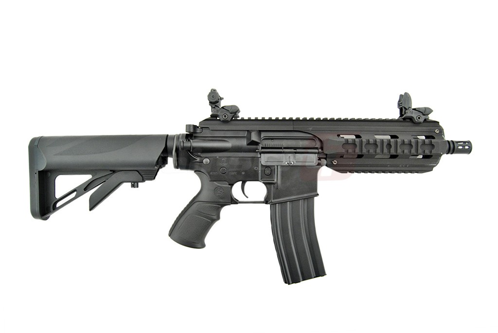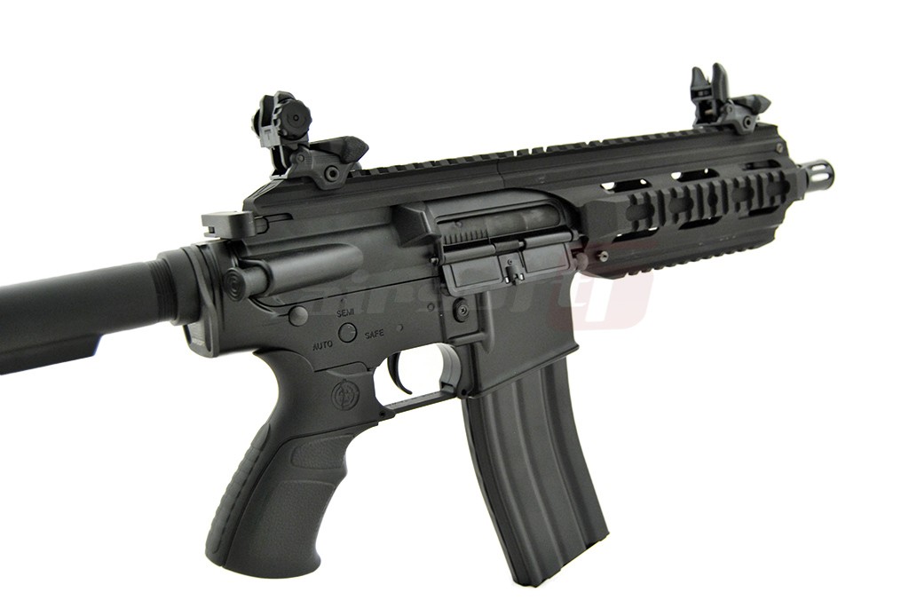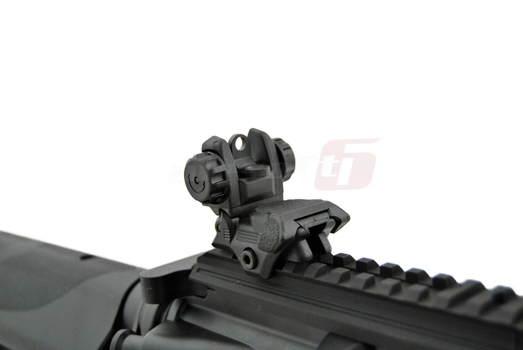 Replica de airsoft este fabricata in parte din materiale metalice, corpul, sistemul de sine si alte elemente. Manerul si patul replicii de airsoft sunt fabricate din plastic ABS rezistent. In partea din fata exista un sistem de sine de tip SIR dintr-o singura bucata de aliaj de aluminiu, ce permite o vasta accesorizare. Replica de airsoft este prevazuta cu un sistem de ochire clasic, rabatabil, permitand astfel montarea unor dispozitive de ochire avansate. Patul replicii de airsoft copiaza modelul SOPMOD si asigura loc pentru acumulator in interiorul sau. Pentru asigurarea replicii de airsoft se poate monta o curea de sustinere pe sling swivel-ul situat la imbinarea intre corp si tubul patului.