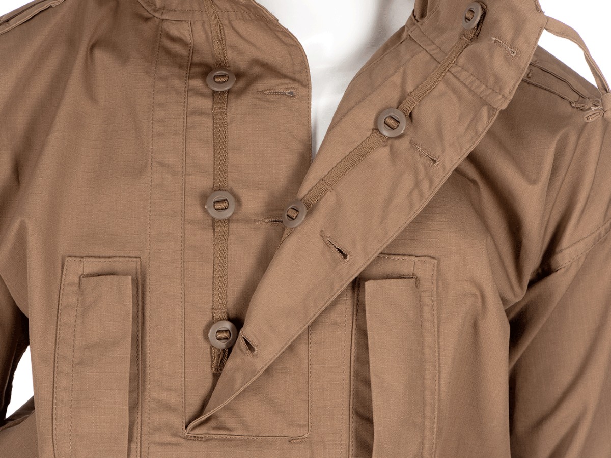 Gluga poate fi ajustata in functie de marimea si conturul fetei; aceasta este prevazuta cu un cozoroc. Pentru a putea auzi cat mai bine sunetele din exterior, gluga este prevazuta cu o insertie de plasa la nivelul urechilor. Jacheta are inchidere cu nasturi cusuti pe fasia de material dublata: este confortabil si sigur. Jacheta are patru buzunare frontale. Snur pentru a ajusta volumul in functie de talia. Pentru a oferi posibilitatea de a suplimenta partea de camuflaj, jacheta este echipata cu gaici speciale destinate pentru fixarea frunzelor, ramelor, etc.