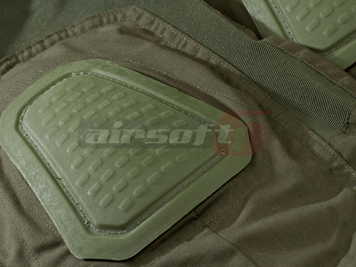 Pantalonii sunt prevazuti cu gaici pentru curea pe toata suprafata taliei, pentru a putea asigura ferm centura in ideea accesorizarii acesteia. In partea din spate a taliei pantalonilor exista o sectiune elastica pentru fixarea pantalonilor. Zone genunchilor este asigurata de un set de genunchiere rigide montate in compartimentul special al pantalonilor. Pentru evacuarea caldurii excesive, desupra genunchilor si deasupra mijlocului existe sectiuni din material poros. In spatele genunghilor exista chingi prevazute cu arici pentru fixarea pozitiei pantalonilor.