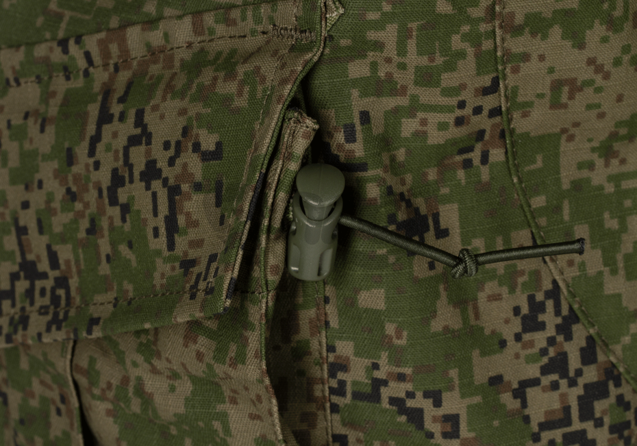 Zona posteriorului este asigurata cu material aditional, inpotriva uzurii. Pantalonul este prevazut cu snururi pentru reglaj in zona bustului dar si in zona gleznelor.