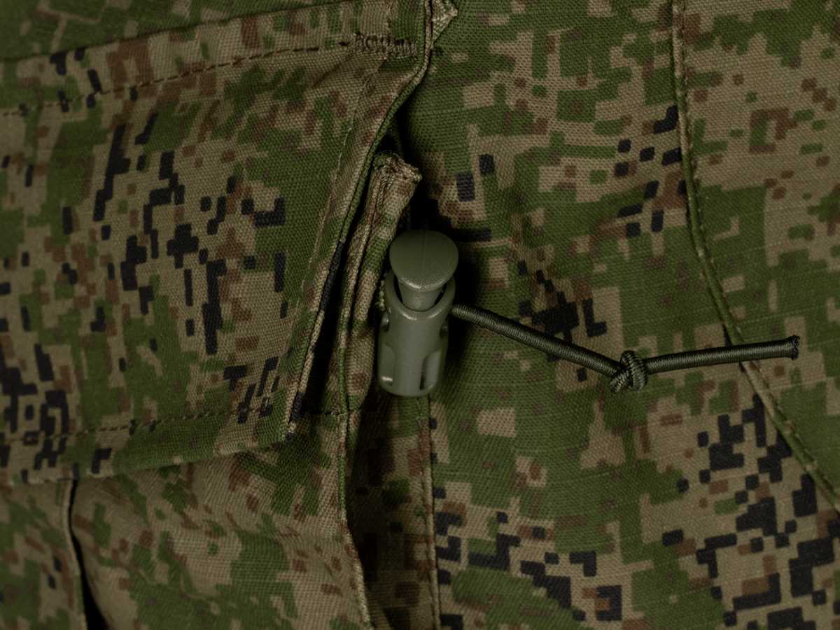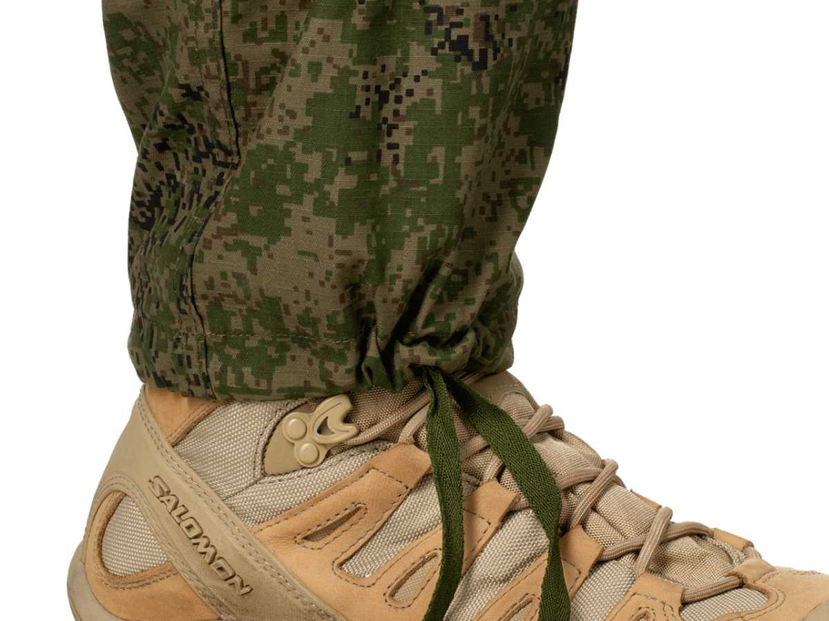 Zona posteriorului este asigurata cu material aditional, inpotriva uzurii. Pantalonul este prevazut cu snururi pentru reglaj in zona bustului dar si in zona gleznelor.