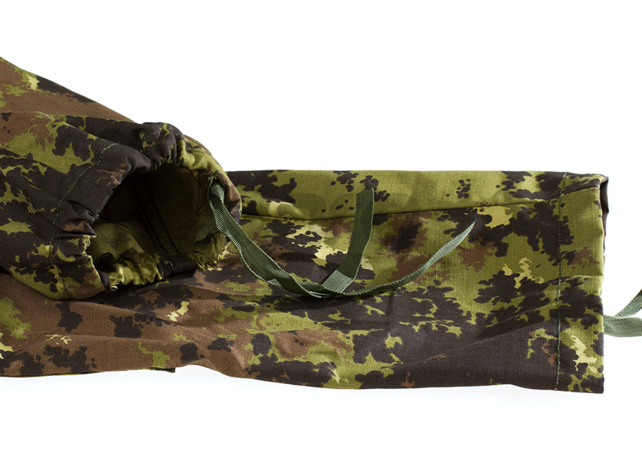 Zona posteriorului este asigurata cu material aditional, inpotriva uzurii. Pantalonul este prevazut cu snururi pentru reglaj in zona bustului dar si in zona gleznelor.