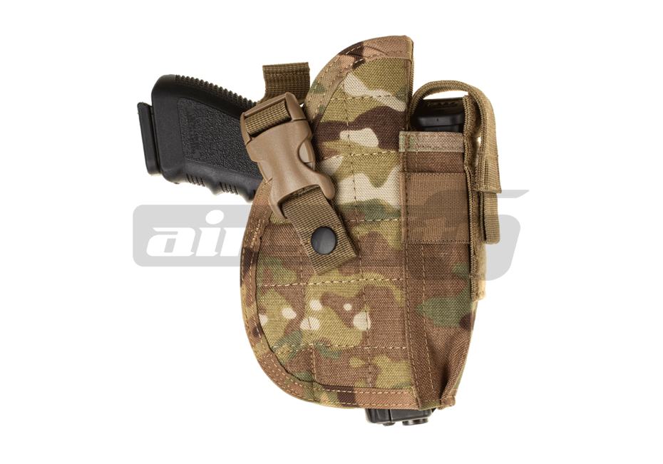 Toc de pistol cu prindere tip scai pentru curea. Utilizand acest tip de prindere, tocul poate fi montat pe orice platforma compatibila cu acest sistem de prindere. Marimea tocului este fixa dar designul sau permita sustinerea unei mari varietati de pistoale de airsoft. Pentru asigurarea pistolului exista o chinga prevazuta cu capsa si catarama pentru fixare dar si detasare rapida. Lungimea chingii poate fi reglata.
