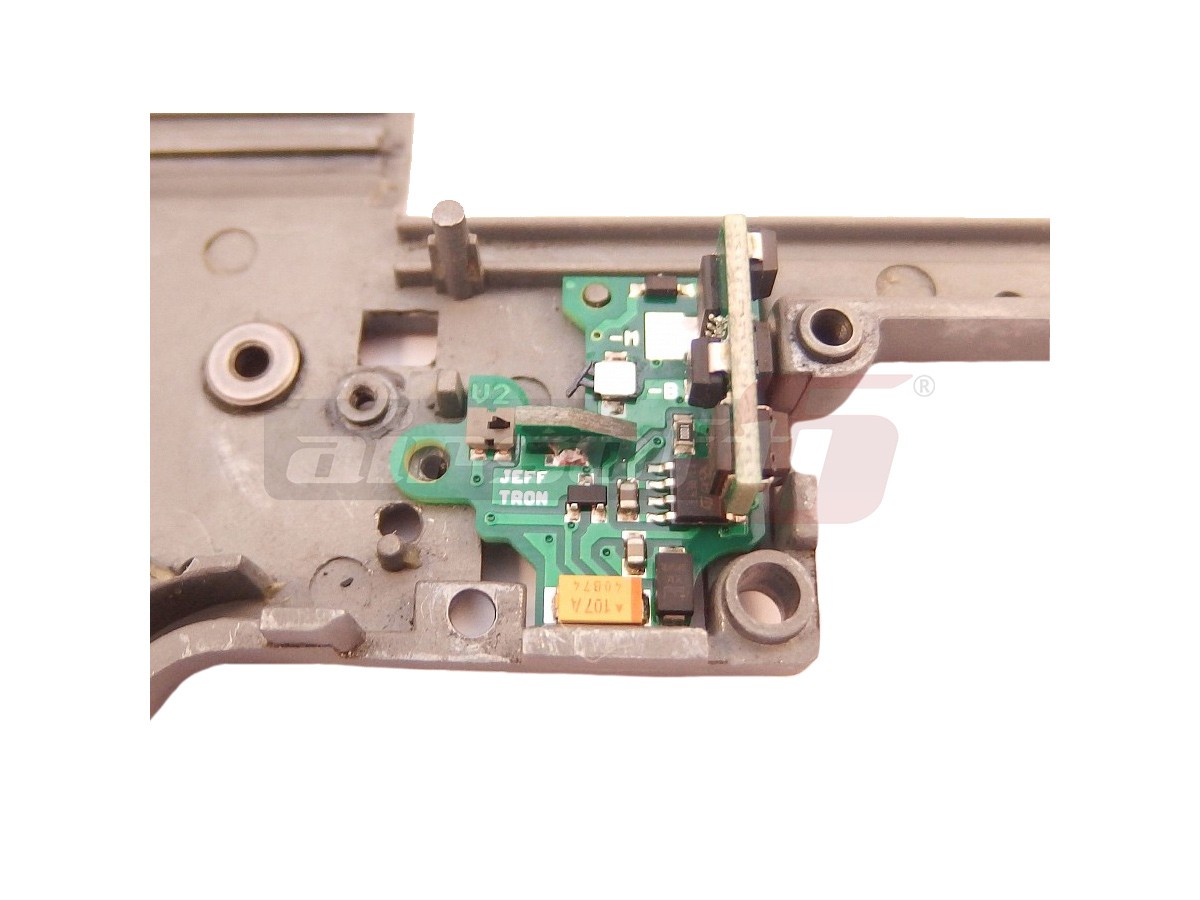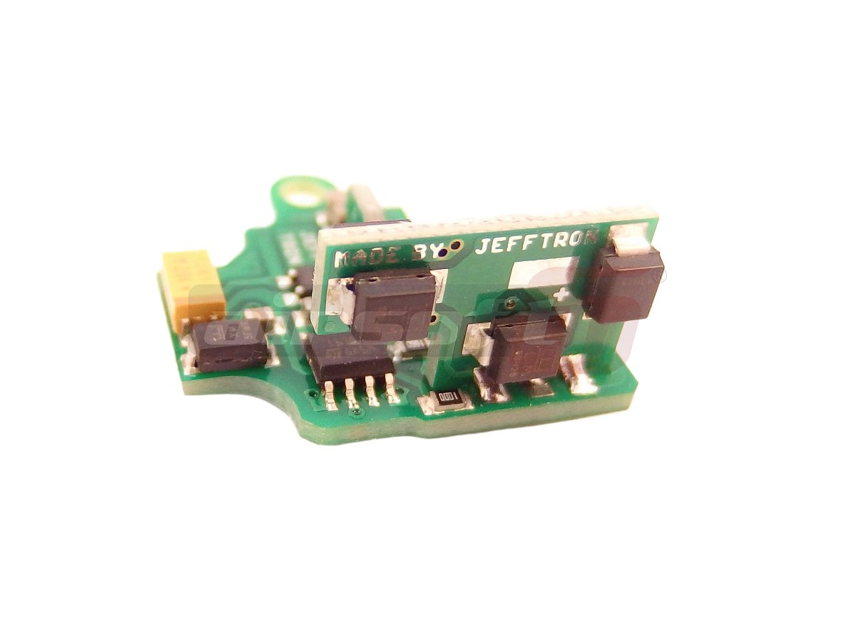 Mosfetul de fata este modelul Processor unit V2. Aceasta este cea mai rafinata optiune prevazuta cu procesor oferita de Jefftron. Aceasta varianta de mosfet permite montarea direct in interiorul gearbox-ului, inlocuind contactul mecanic al gearbox-ului. Astfel toate optiune modurilor de foc sunt inlocuite cu senzori si microcontacti capabili sa ofere un feedback net superior comenzilor mecanice. Rapunsul tragaciului este net superior iar selectia modului de foc este mult imbunatatita.Functiile sale sunt dupa cum urmatoarele: