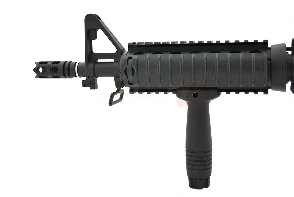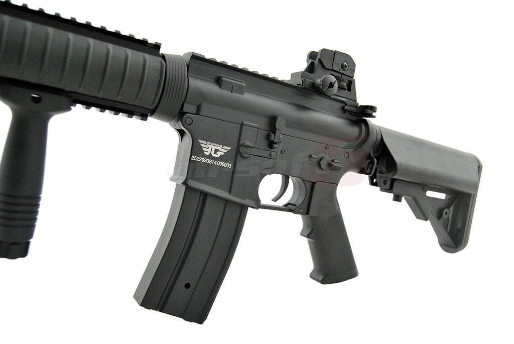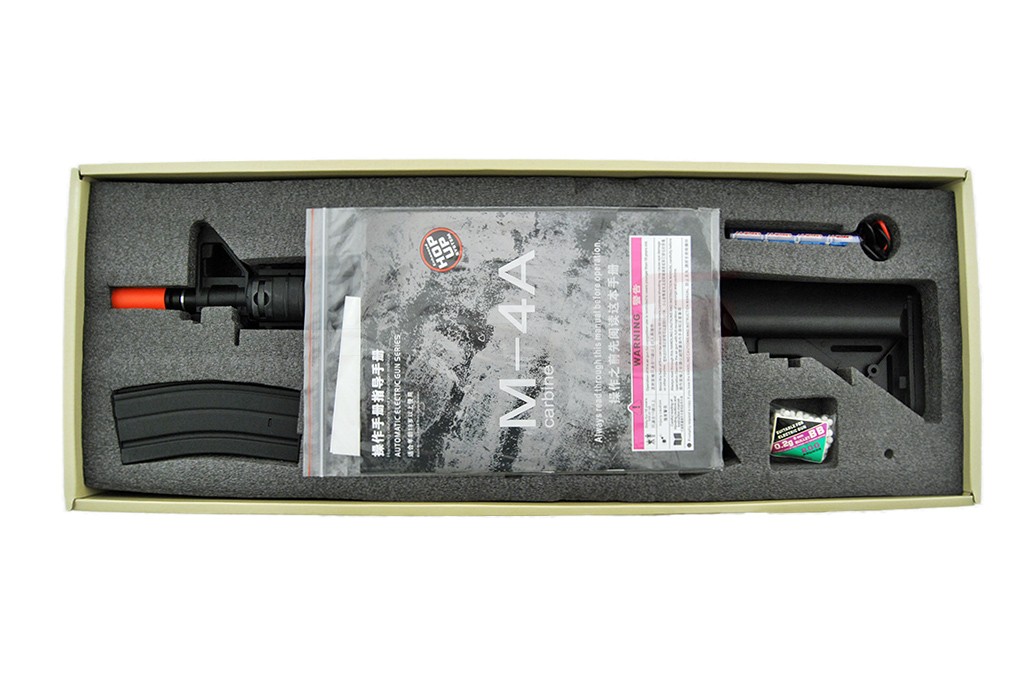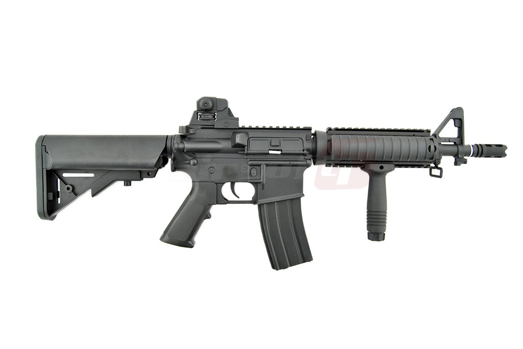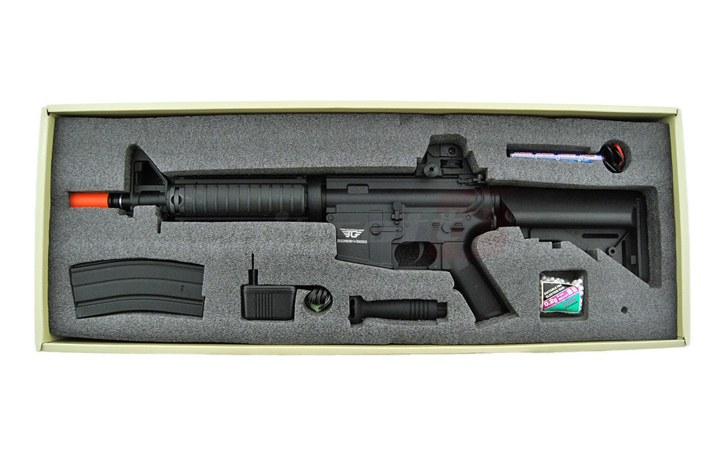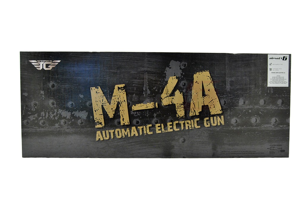 Avem placerea de a va prezenta M4 A1 CQB fabricat de catre Jing Gong. Aceasta jucarie de airsoft este fabricata intr-un procentaj mare din materiale metalice. elementele din plastic ABS sunt manerele si patul. In partea frontala exista un sistem de sine RIS ce permite o vasta accesorizare; lasere, lanterne, manere, ornamente si asa mai departe. Deasupra corpului exista o sina standard ce permite montarea unor dispozitive de ochire avansate. Sau putem utiliza sistemul de ochire integrat, reglabil bineinteles.