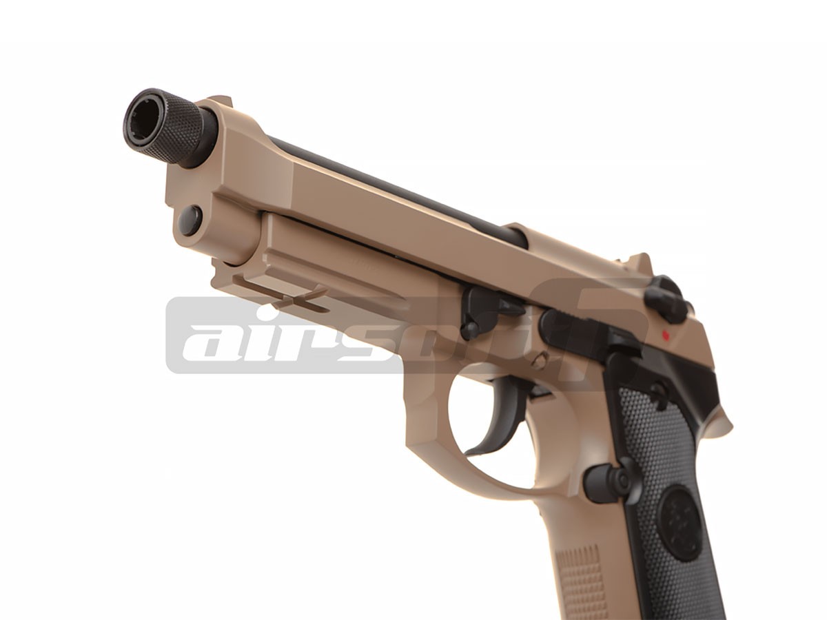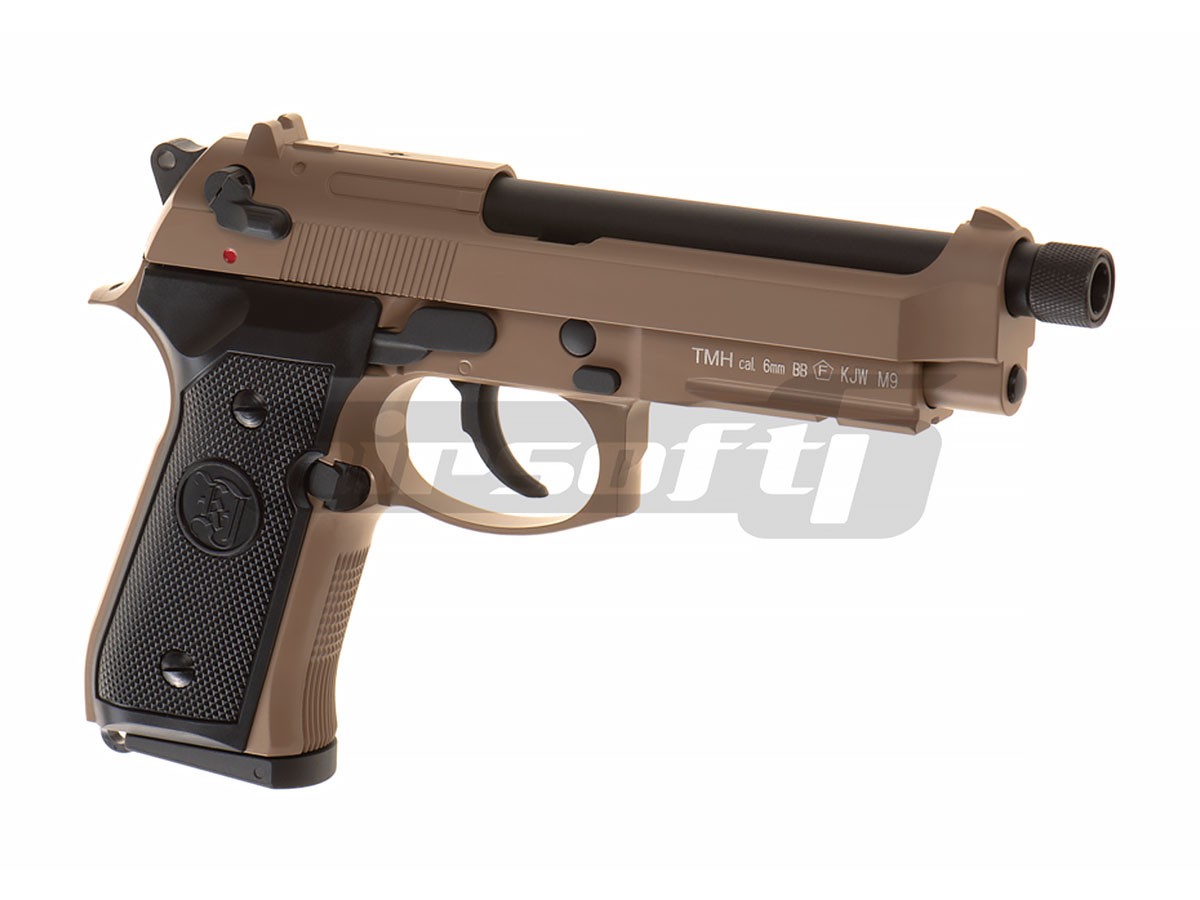 Aceasta replica de airsoft produsa de KJW copiaza pistolul M9A1, replicand atat aspectul exterior cat si functionalitatea acestuia. Este fabricat in intregime din metal cu preselele din plastic ABS oferind astfel o senzatie de autenticitate in momentul exploatarii. Reculul are un sunet metalic si o putere destul de mare. In partea frontala exista o sina pe care pot fi montate accesorii tractice precum lasere sau lanterne. Siguranta este ambidextra, situata deasupra manerului in spatele mansonului. In partea dreapta exista butonul pentru indepartarea incarcatorului, mag catch.