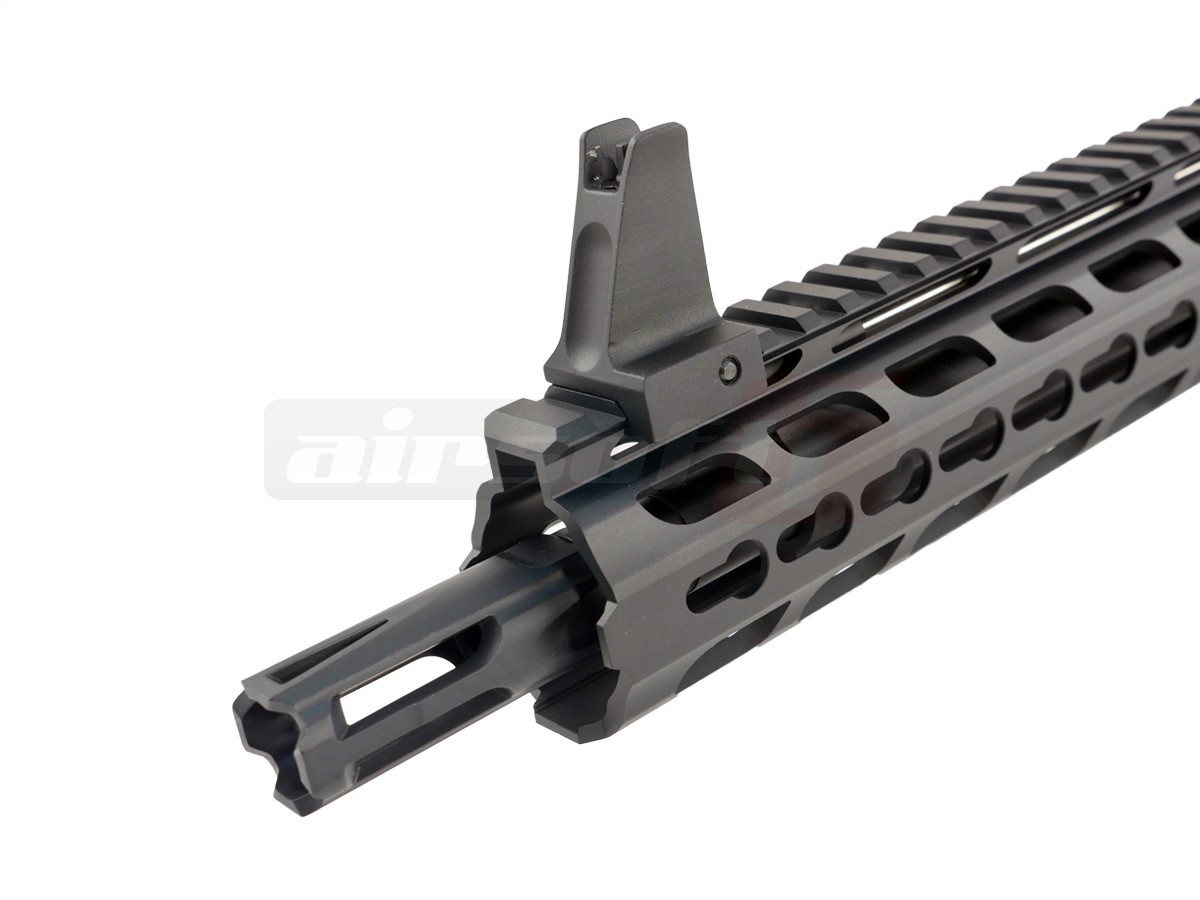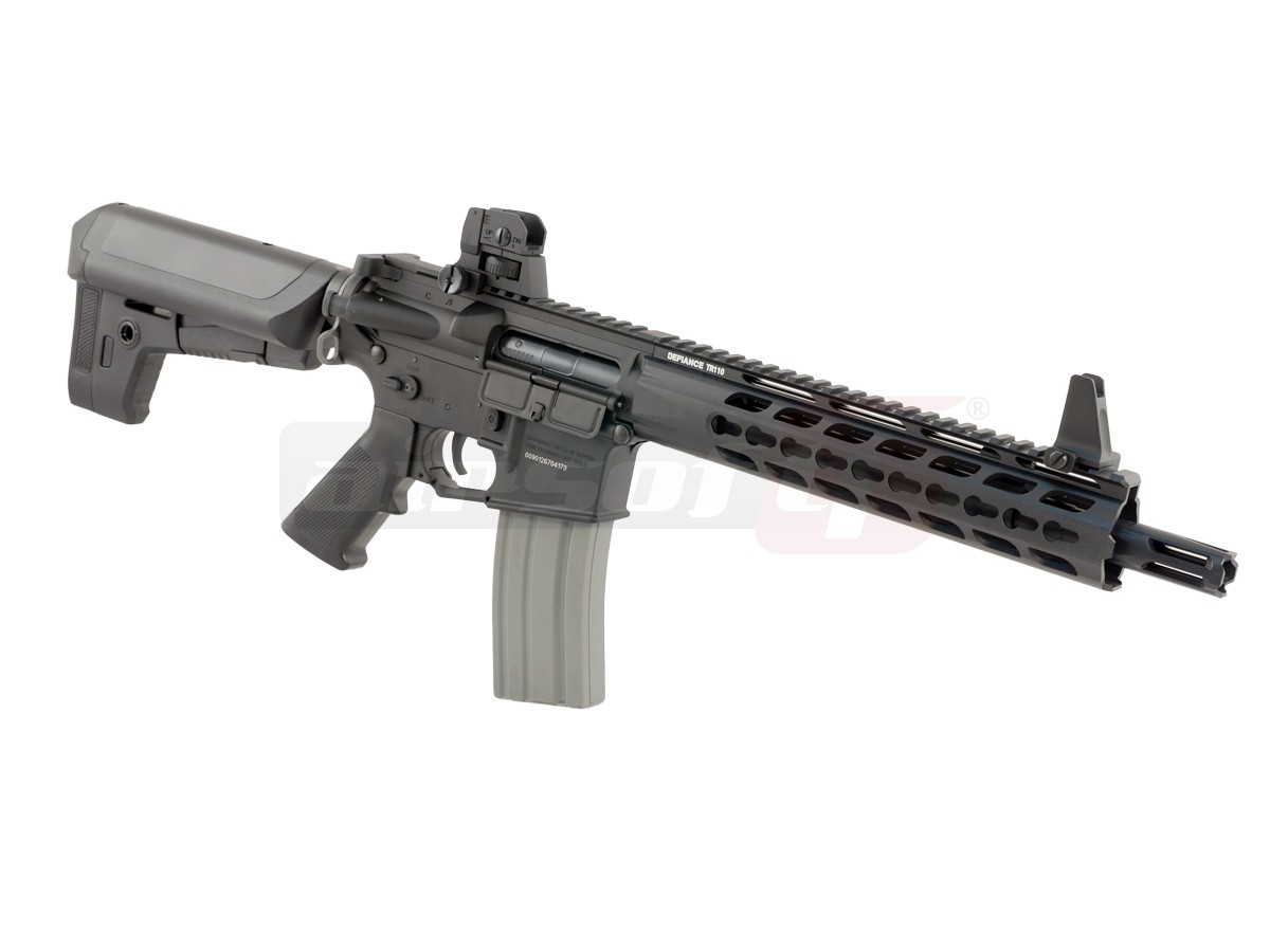 Partea interesanta este gearbox-ul, in care au investit multe resurselor pentru a oferi un produs final de calitate superioara. Aliajul din care este realizata carcasa este unul foarte rezistent, eliminand din problemele generate de arcurile puternice. Designul gearbox-ului este relativ standard, permitand inlocuirea majoritatii componentelor interne dupa bunul plac. Nu se putea spune ca am pasit in secolul urmator decat daca replica este dotata arc usor inlocuibil. Producatorul a dotat replica cu un mosfet simplu pentru a elimina arderea contactului existent in urma utilizarii acumulatorilor de 11.1V LiPo si a motorului de mare putere cu care este dotata replica. Viteza proiectilelor este in jur de 115 - 120 m/s masurata cu bile de 0.20g. O caracteristica importanta este cadenta cu care replica este capabila sa actioneze si anume peste 22 bile pe secunda cu LiPo de 11.1V. Teava interna are un diametru de 6.05mm iar camera de hop permite un reglaj fin al nivelului de hopup, datorita insemnelor de pe roata de reglaj.