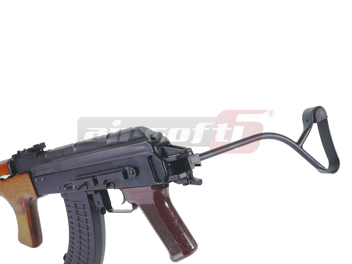 Corpul replicii de airsoft este fabricat din tabla otelita groasa, nituita. Marcajele sunt stantate. Partile de imbinare ale replicii de airsoft sunt fabricate din otel de calitate contribuind la o rezistenta buna. Manerul replicii de airsoft este fabricat din plastic ABS rezistent. Patul replicii este de tip rabatabil iar ulucul este cu maner frontal incorporat