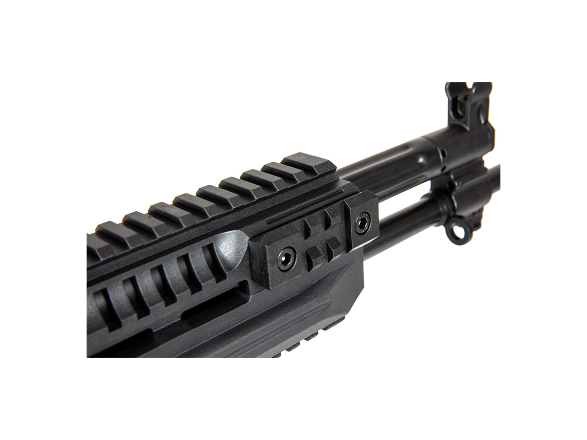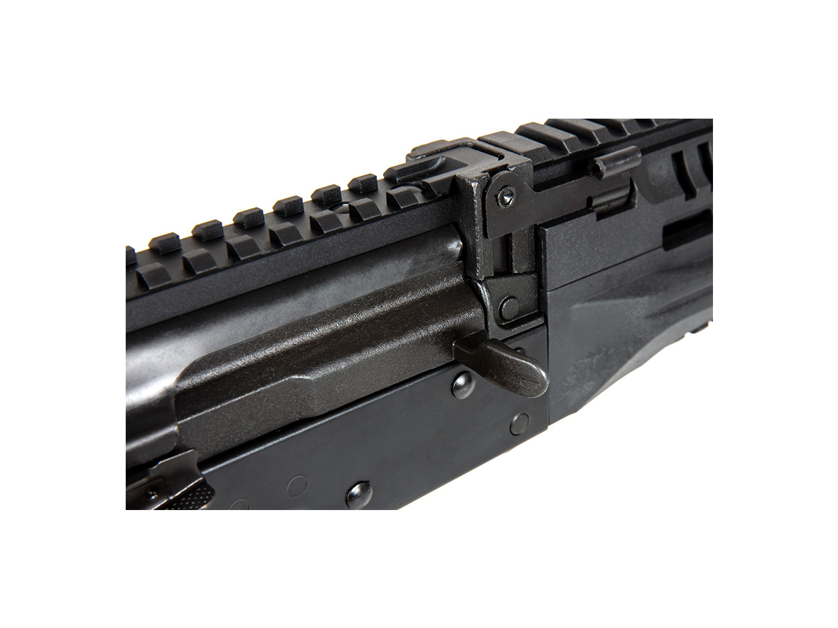 In interiorul acestei replici treaba grea este realizata de catre un gearbox versiune 3 din metal, dotat cu componente premium. Motorul replicii de airsoft este de tip High Torque iar arcul montat genereaza aproximativ 105-110 m/s utilizand bile cu greutatea de 0.20g. Camera de hopup este reglabila iar teava interna are un diametru de 6.08mm, odata setat corect nivelul de hopup raza de actiune a replicii de airsoft si grupajul sunt impresionante. Reglajul camerei de hopup este in interiorul portului ejector iar pentru a avea acces la el este suficient actionarea levierului fals de armare.