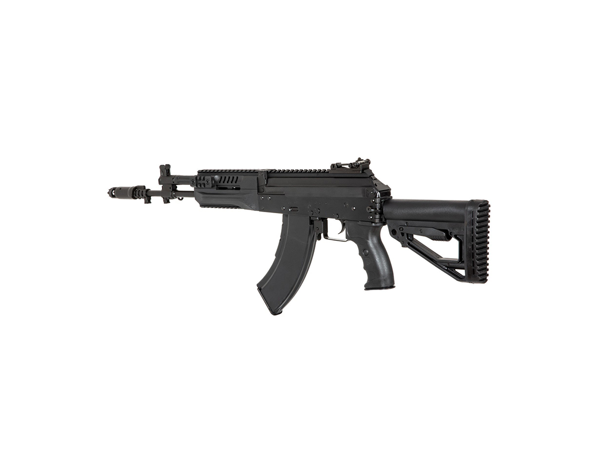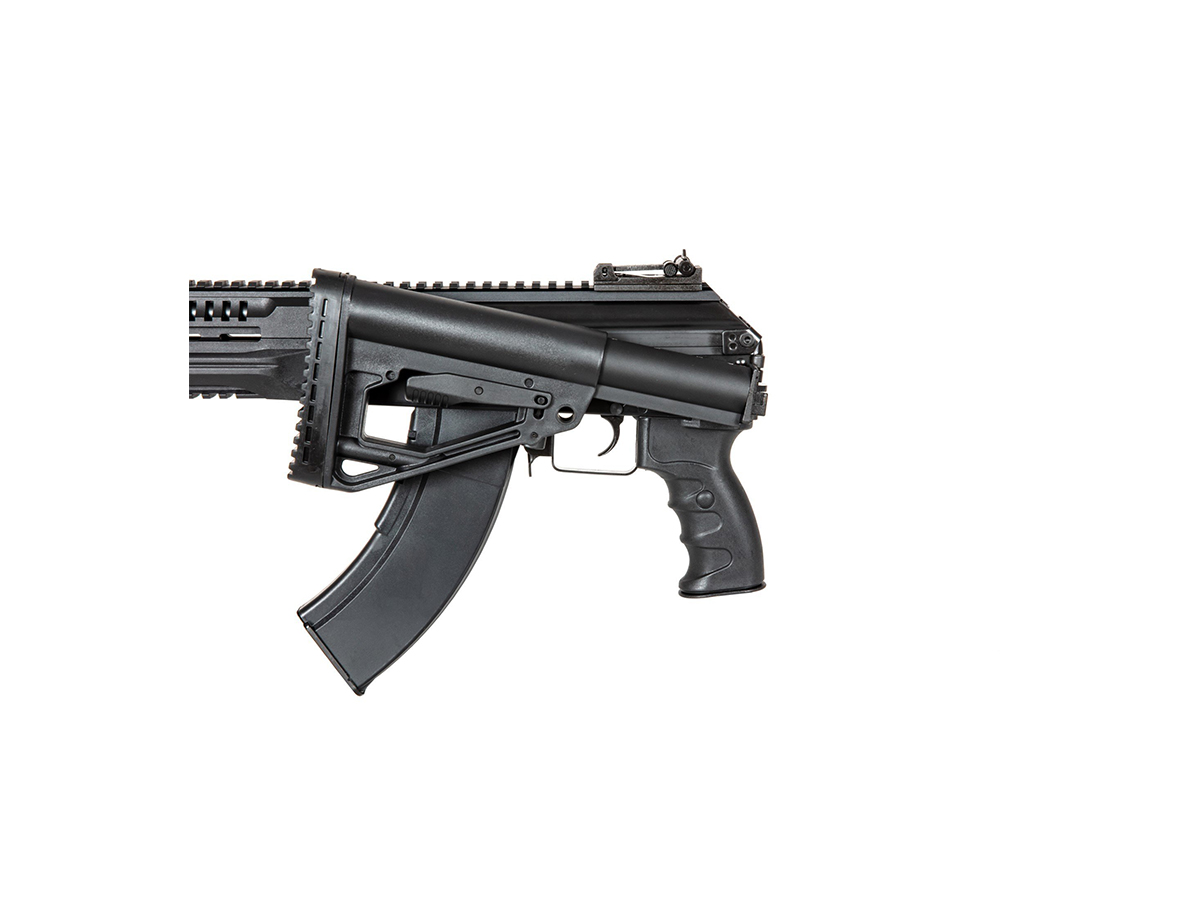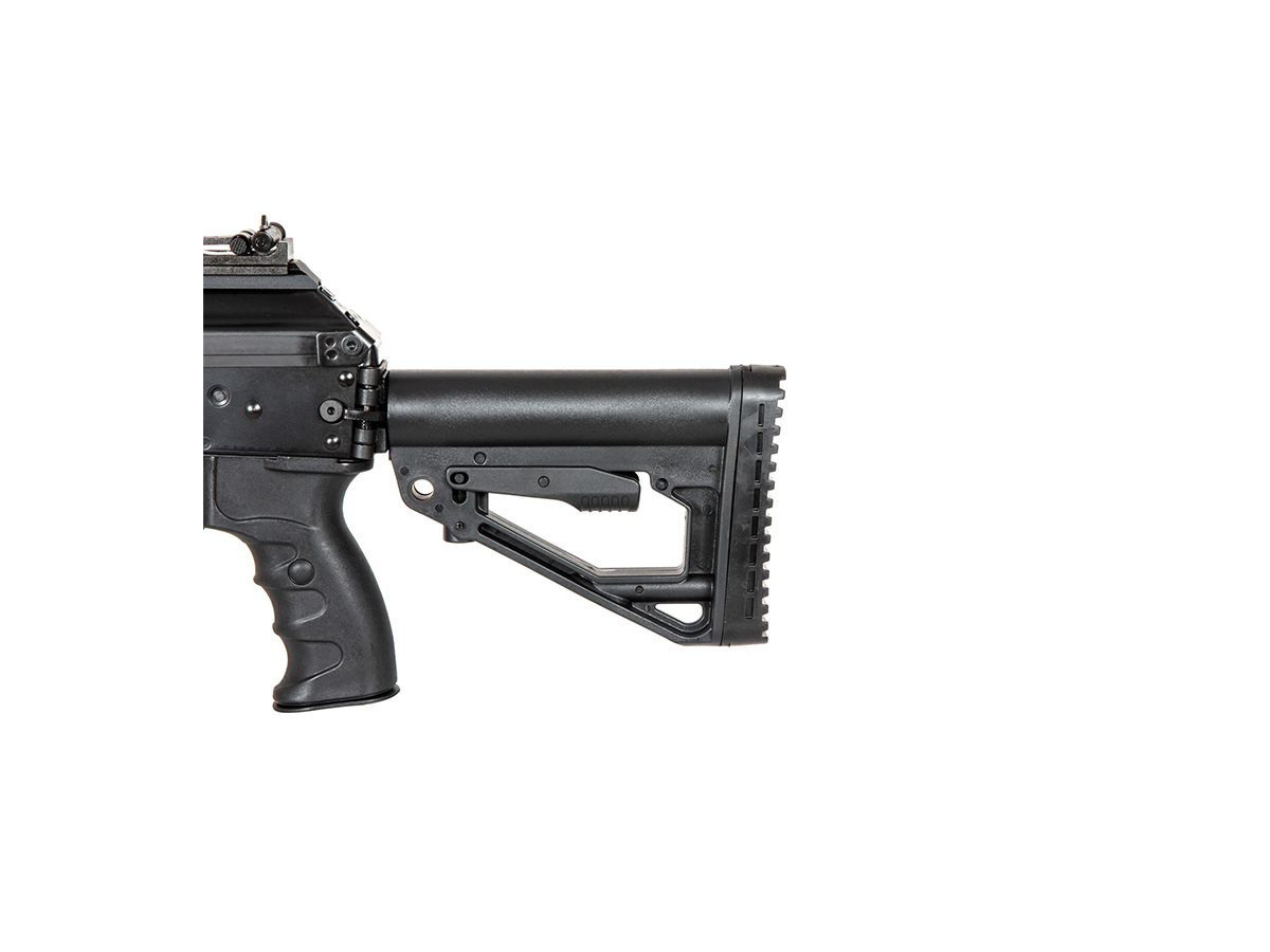 Corpul replicii de airsoft este fabricat din tabla otelita groasa, nituita. Marcajele sunt stantate. Ulucul, manerul si patul sunt fabricate din plastic ABS. Partile de imbinare ale replicii de airsoft sunt fabricate din otel de calitate contribuind la o rezistenta buna. Patul replicii este reglabil dar si rabatabil pe lateral, usurand astfel transportul.