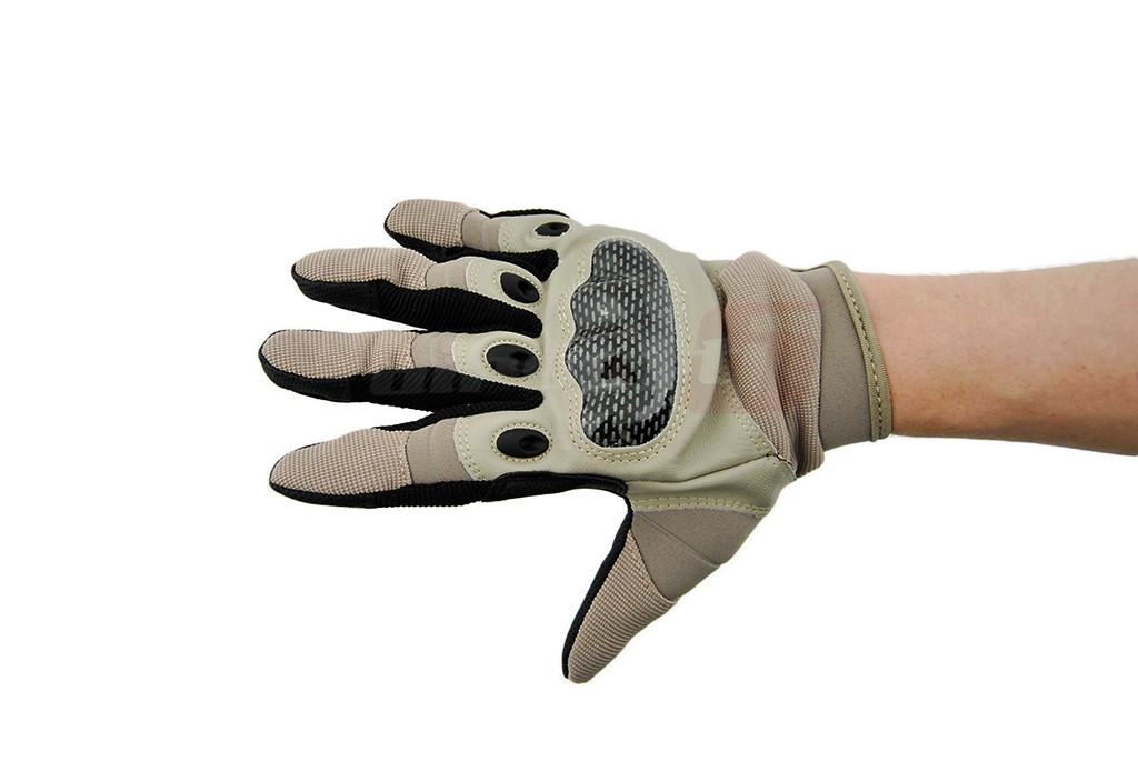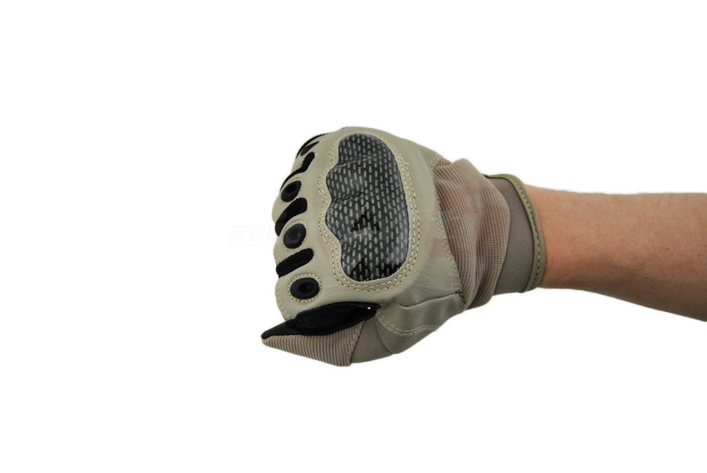 In partea superioara monturile mainii sunt protejate de o sectiune din nylon rigida cu forma anatomica. partea frontala este acoperita cu piele sintetica rezistenta impotriva uzurii si o tesatura de spandex cu un grad mare de respirabilitate pentru evacuarea caldurii si umezelii excesive pastrand un confort termic optim. Partea inferioara este acoperita cu material aderent din plastic cauciucat pentru imbunatatirea manevrabilitatii. Inchetetura manusii este reglabila pentru a evita alunecarea ei afara din mana.