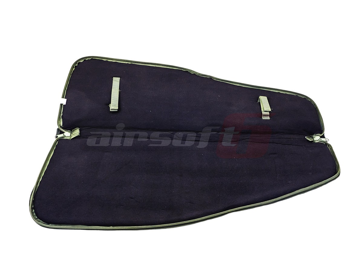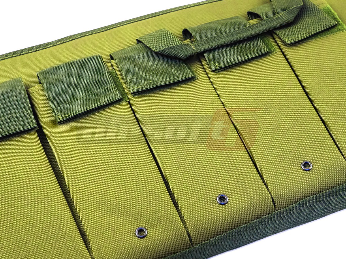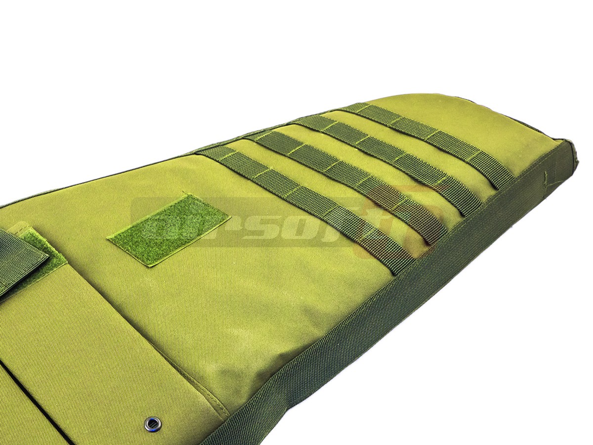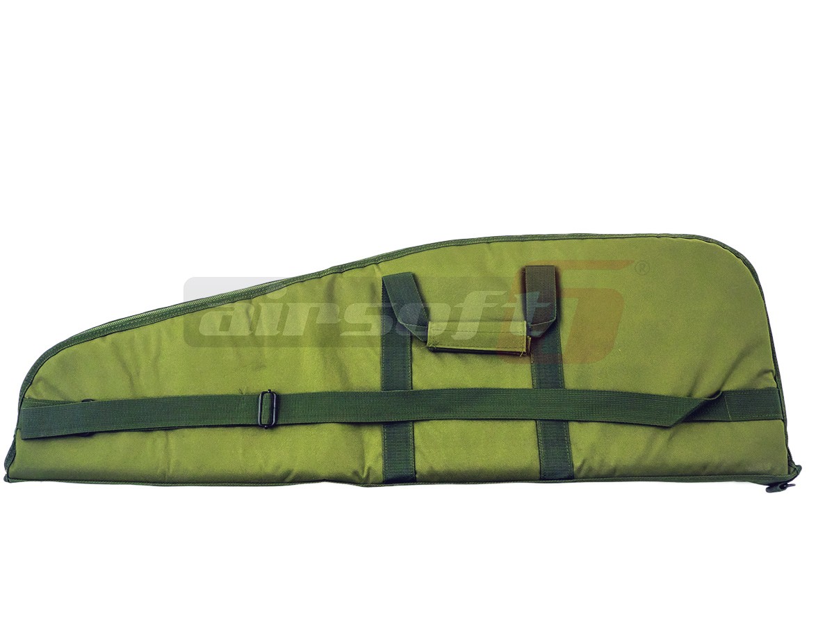 Geanta destinata transportului replicilor de airsoft. Aceasta geanta prezinta un compartiment incapator de depozitare pentru replicile cu lungimea maxima de 100 cm. Pe lateralul gentii se pot observa 5 port-incarcatoare compatibile atat cu incarcatoarele platformei M4 dar si AK. Tot pe lateralul gentii putem observa in partea din fata un sistem de prindere molle dar si o suprafara de pasla pentru accesorizarea cu patch-uri, embleme sau insigne (cu prindere tip velcro).