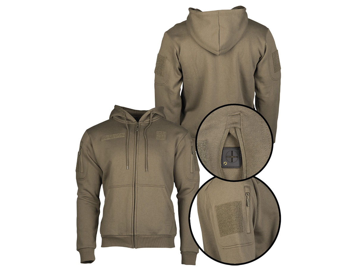 Acest hanorac oferit de Mil-tec este fabricat dintr-un amestec de poliester si bumbac in proportie de 40% si 60%. Se potriveste perfect pe corp, nu e nici prea liber nici prea strans, este potrivit ca imbracaminte casual, pentru drumetii, pentru pescuit, fie pe exterior sau sub o geaca. In partea superioara a bratelor exista doua buzunare prevazute cu fermoar si sectiuni prevazute cu arici pentru atasarea ecusoanelor sau patch-urilor prevazute cu arici . De asemenea pe piept exista sectiuni cu arici. Exista 2 buzunare mari in partea frontala si de jos, manecile si partea inferioara exista sectiuni elastice pentru a putea pastra forma inchisa astfel asigurand crearea unei perne de aer cald. Gluga acestui hanorac este reglabila permitand mentinerea formei cat mai corect.