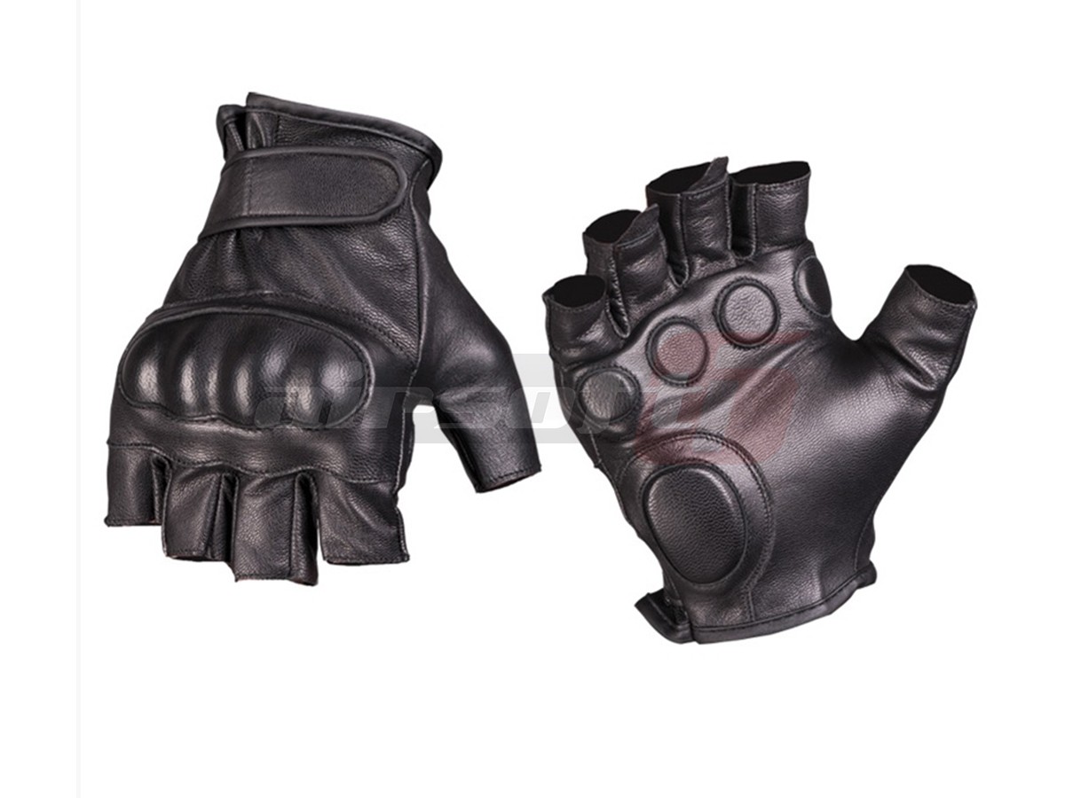 Manusi din piele oferite de Mil-Tec. Modelul de fata este unul fara degete, permitand un simt tactil foarte bun. Monturile sunt protejate de un suport rigid, dur iar palma este prevazuta sectiuni ingrosate pentru imbunatatirea confortului dar si a aderentei. Manusile sunt realizate din piele naturala iar insertiile din materiale sintetice.