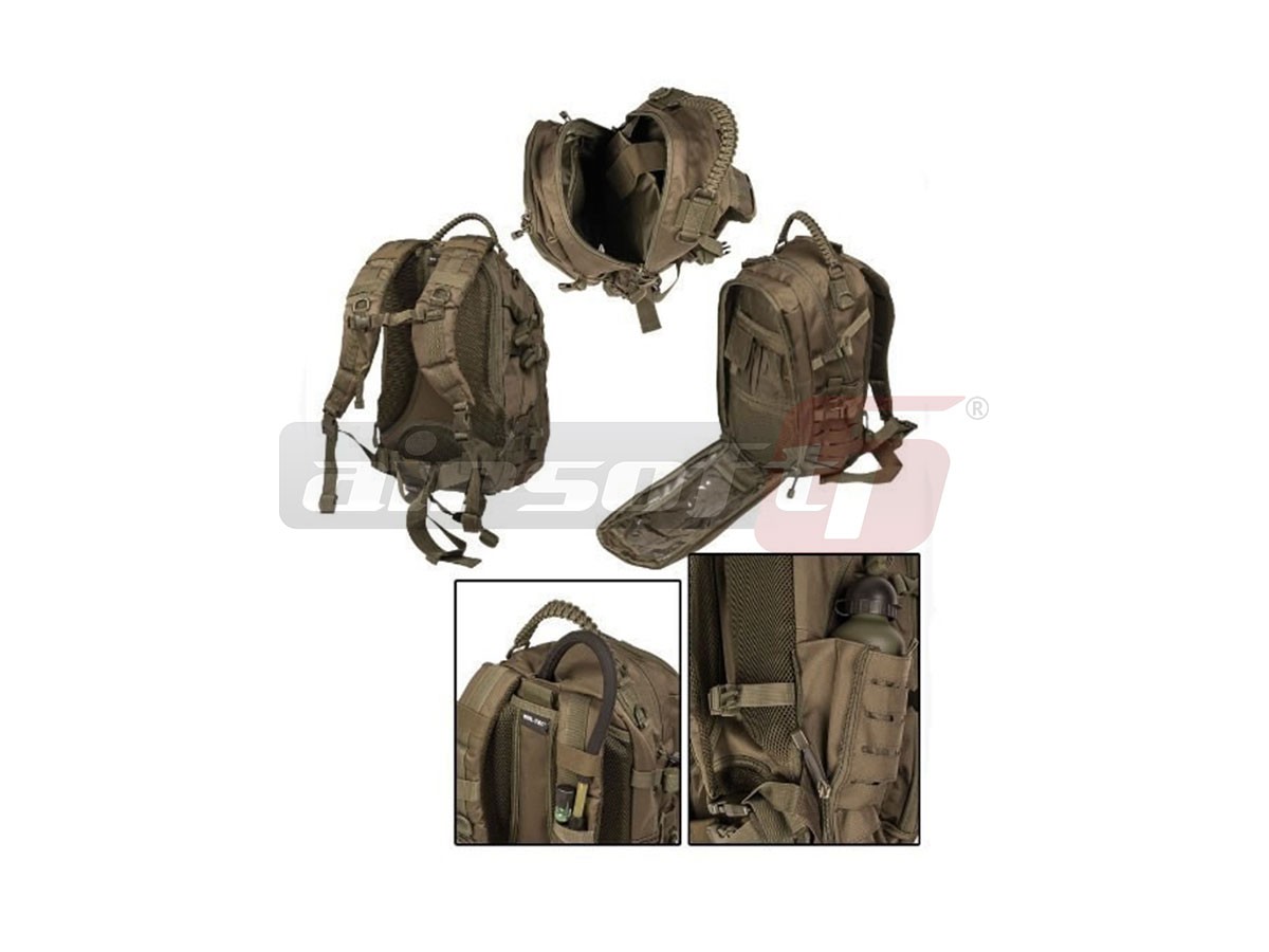 Rucsac tactic marca Mil-Tec destinat actiunilor militare. Acest rucsac este fabricat din Nylon 600D rezistent, captusit cu material plastic impermeabil. Bretelele sunt reglabile iar in partea centrala exista un sistem de prindere intre ele pentru o mai buna asigurare a rucsacului in caz de actiuni fizice intense. Tot pentru asigurare exista o curea in jurul taliei, reglabila prevazuta cu carabina rapida.